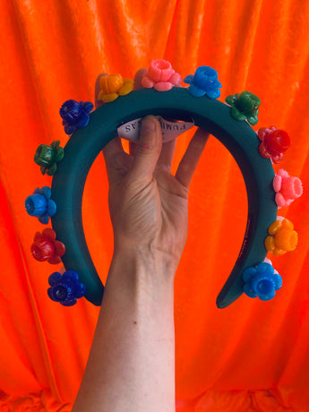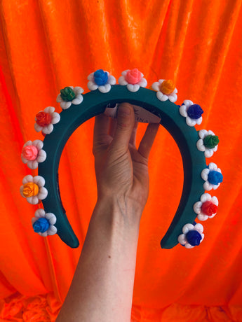 Original 60s hair bobbles in a rainbow of colours attached to a padded bright headband. This design is on a Teal green headband with two different styles of flowers front and back, making it reversible. Super fun, cute and Kitsch.