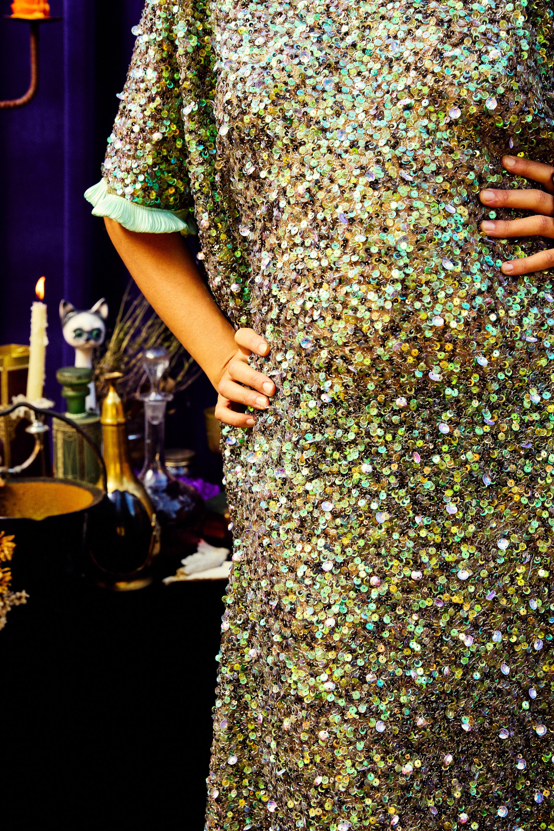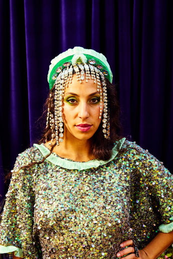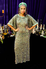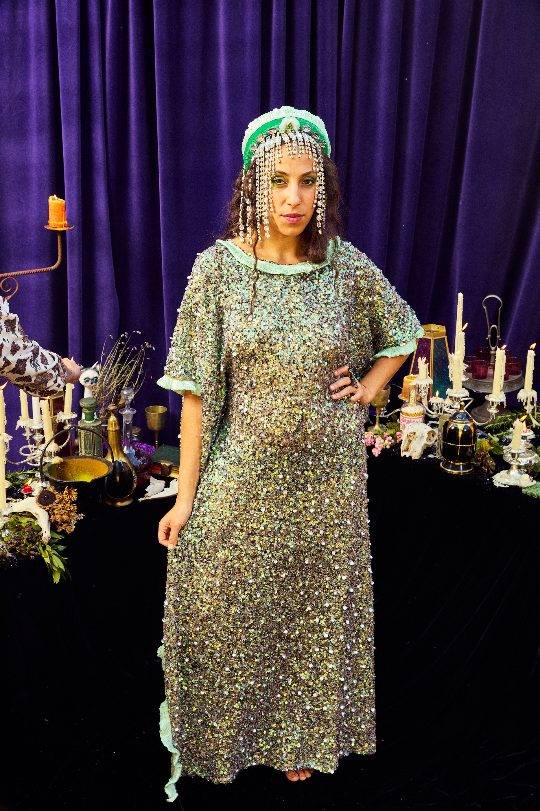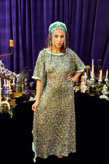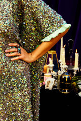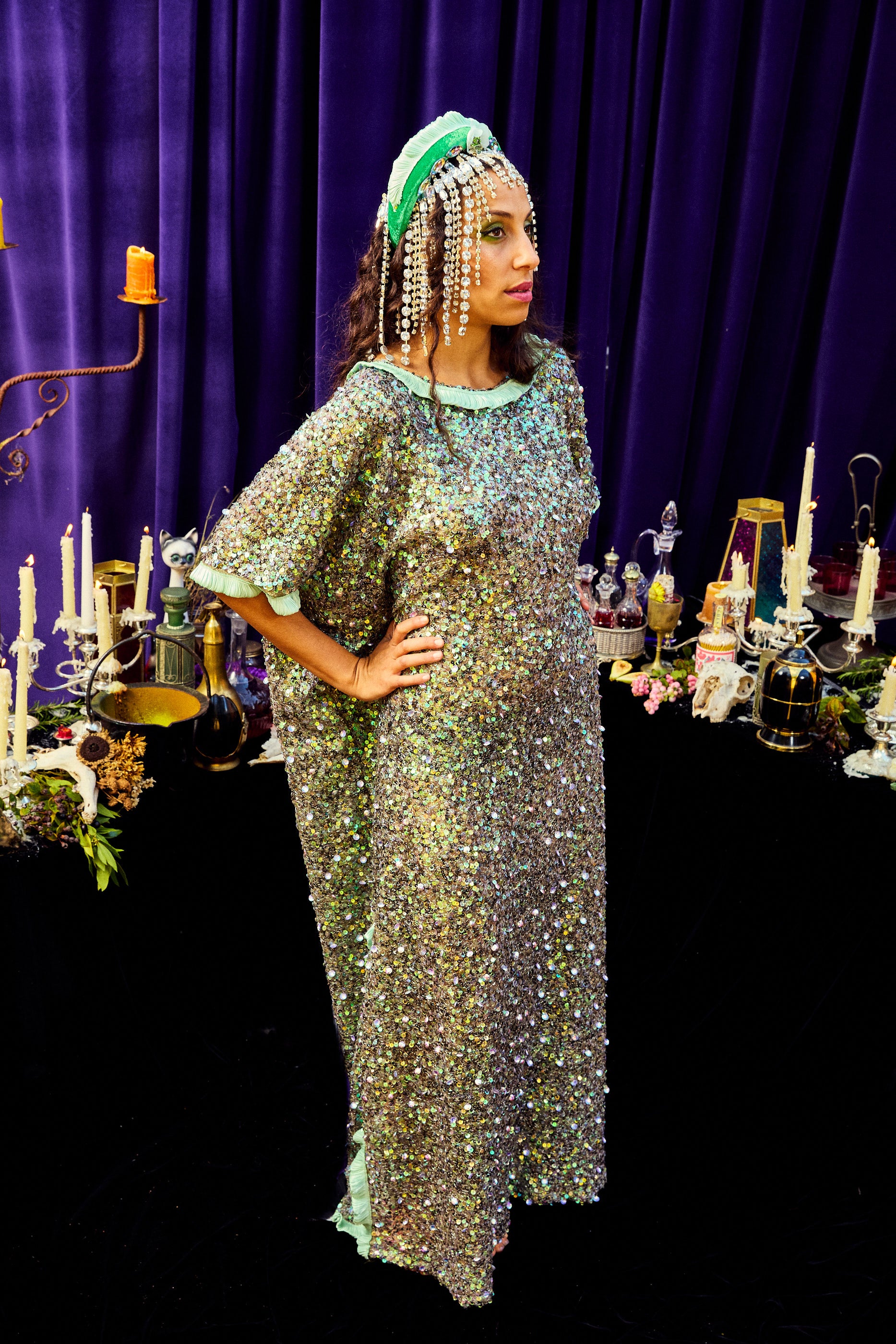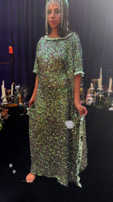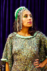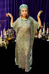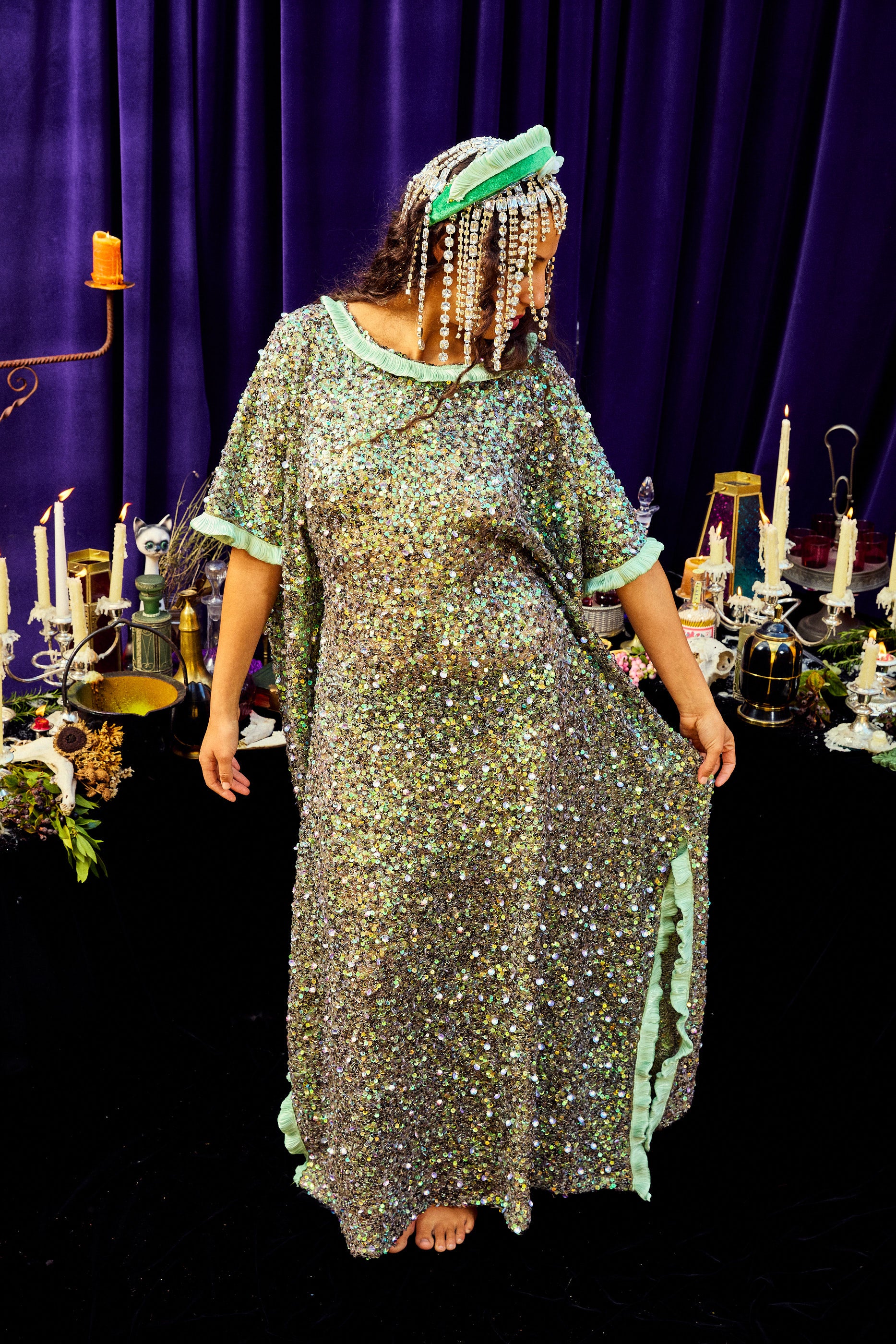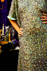 The Mireveil is a round neck Kaftan Gown, drenched in iridescent green sequins on an unusual wire-like base with some stretch. Finished with soft mint ruffle trims at the sleeves, around the collar and at each side split. Finished with our signature hidden ribbons for adaptable styling.