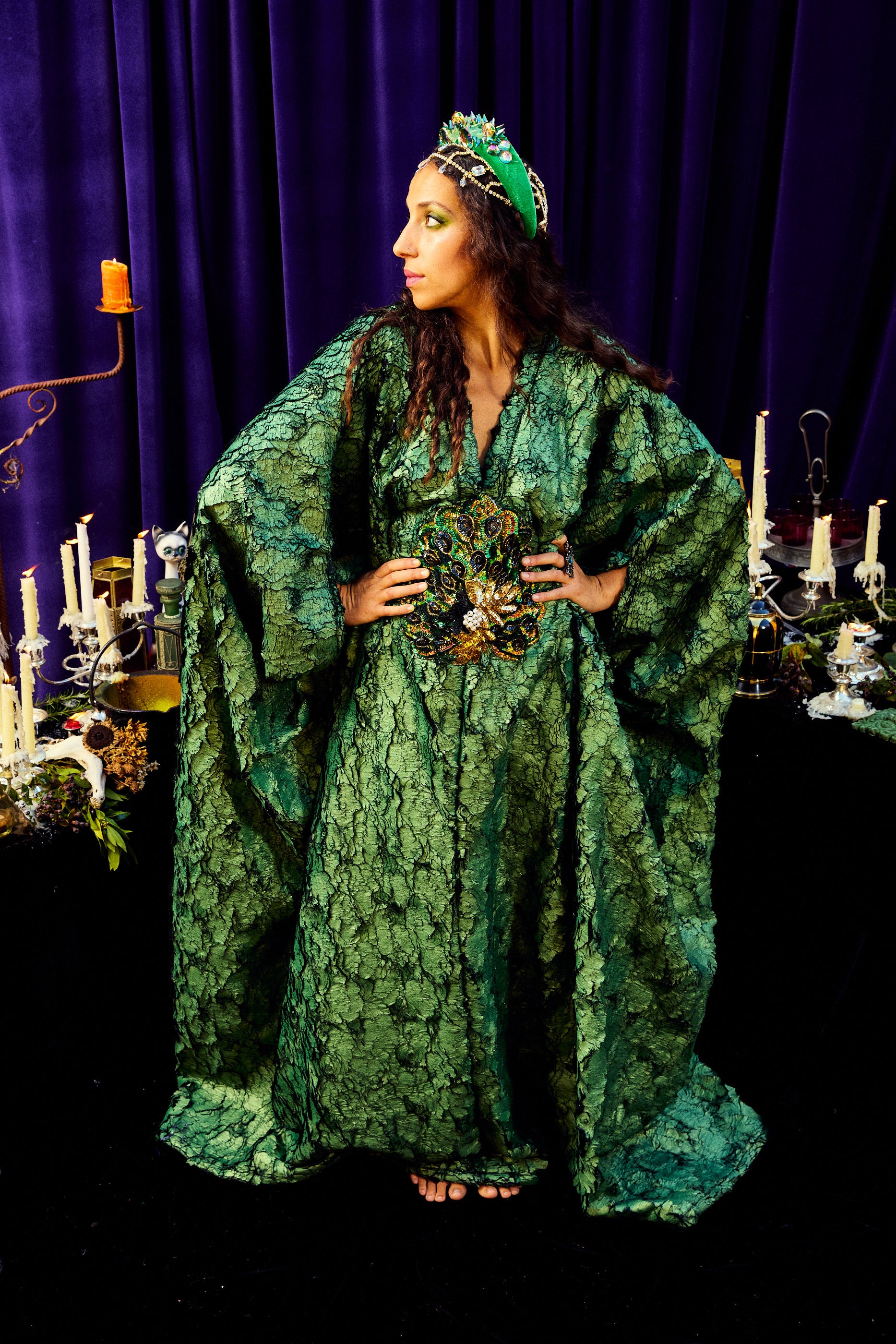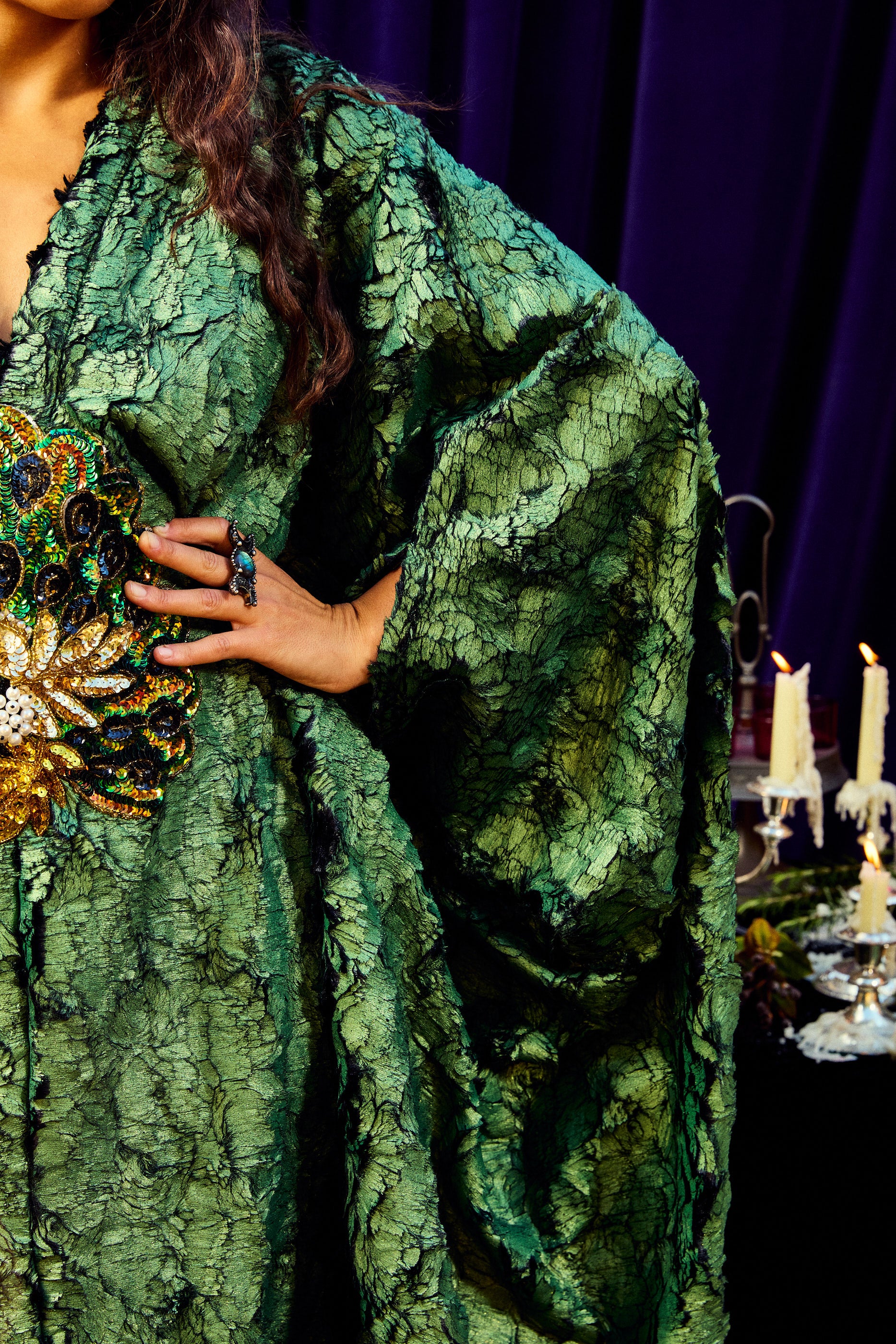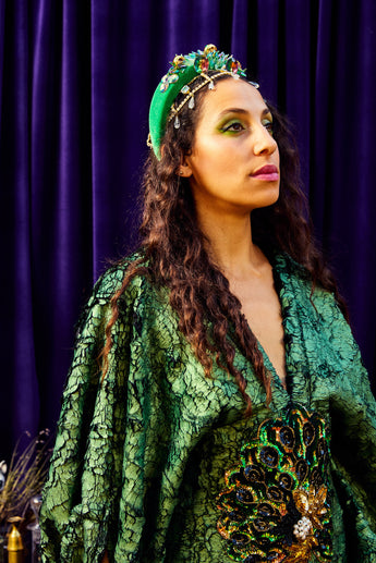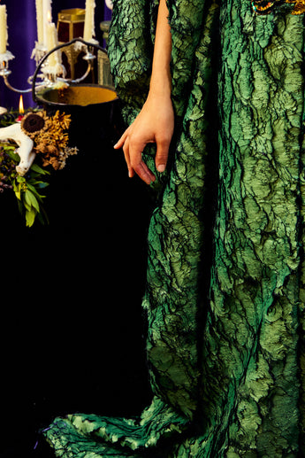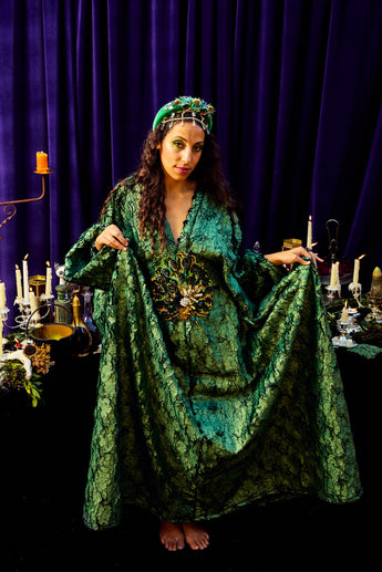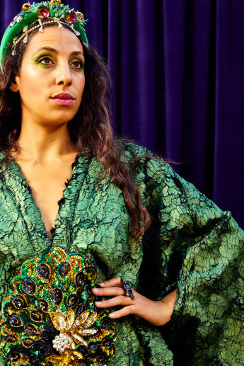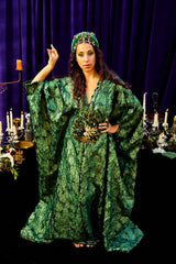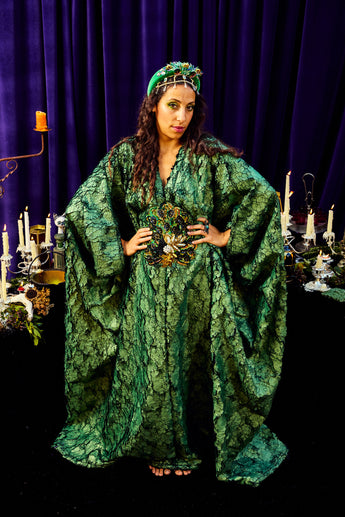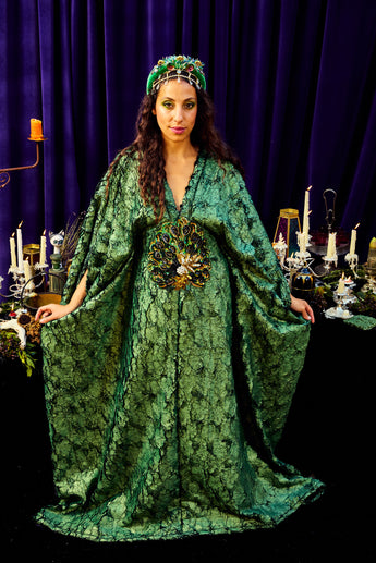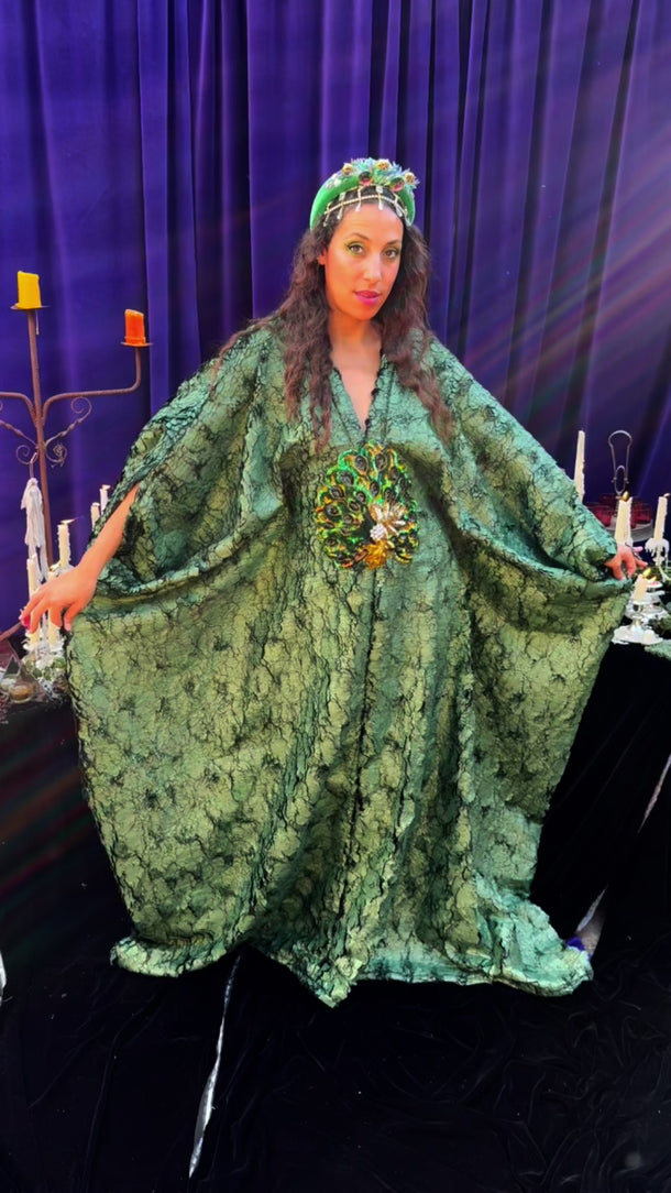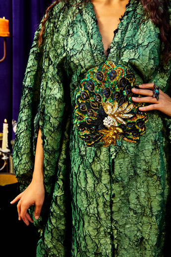 The Cindermoss is a V-neck Kaftan Gown in deep forest green in a shimmer tinge soft crackle effect fabric. The fabric has a textured depth of moss and bark. At the centre is a beaded and sequined plume of peacock feathers. Finished with our signature hidden ribbons for adaptable styling.