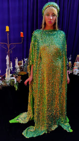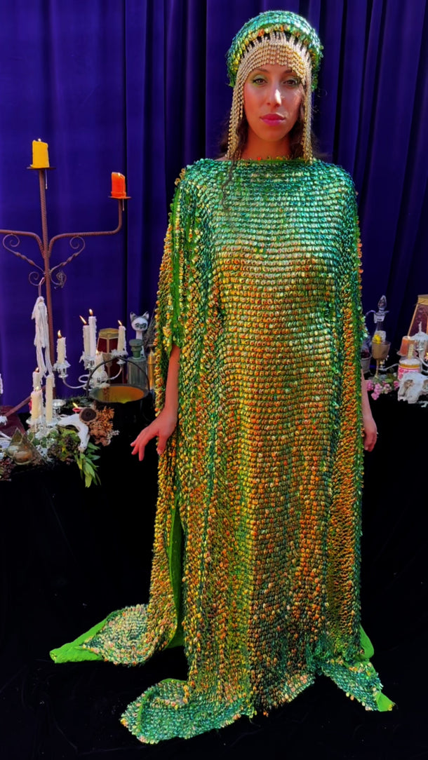 The Dracona Kaftan Gown is a floor-length gown crafted from iridescent green and gold sequin fabric, evoking the scales of mythical serpents. With splits up the sides to reveal flashes of venom green silk lining and finished with our signature hidden ribbons for adaptable styling. This piece is HEAVY, like a cloak of armour, and should be worn with care and consideration.