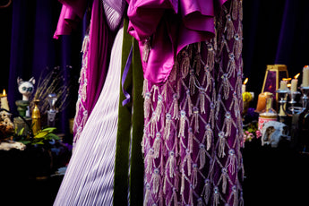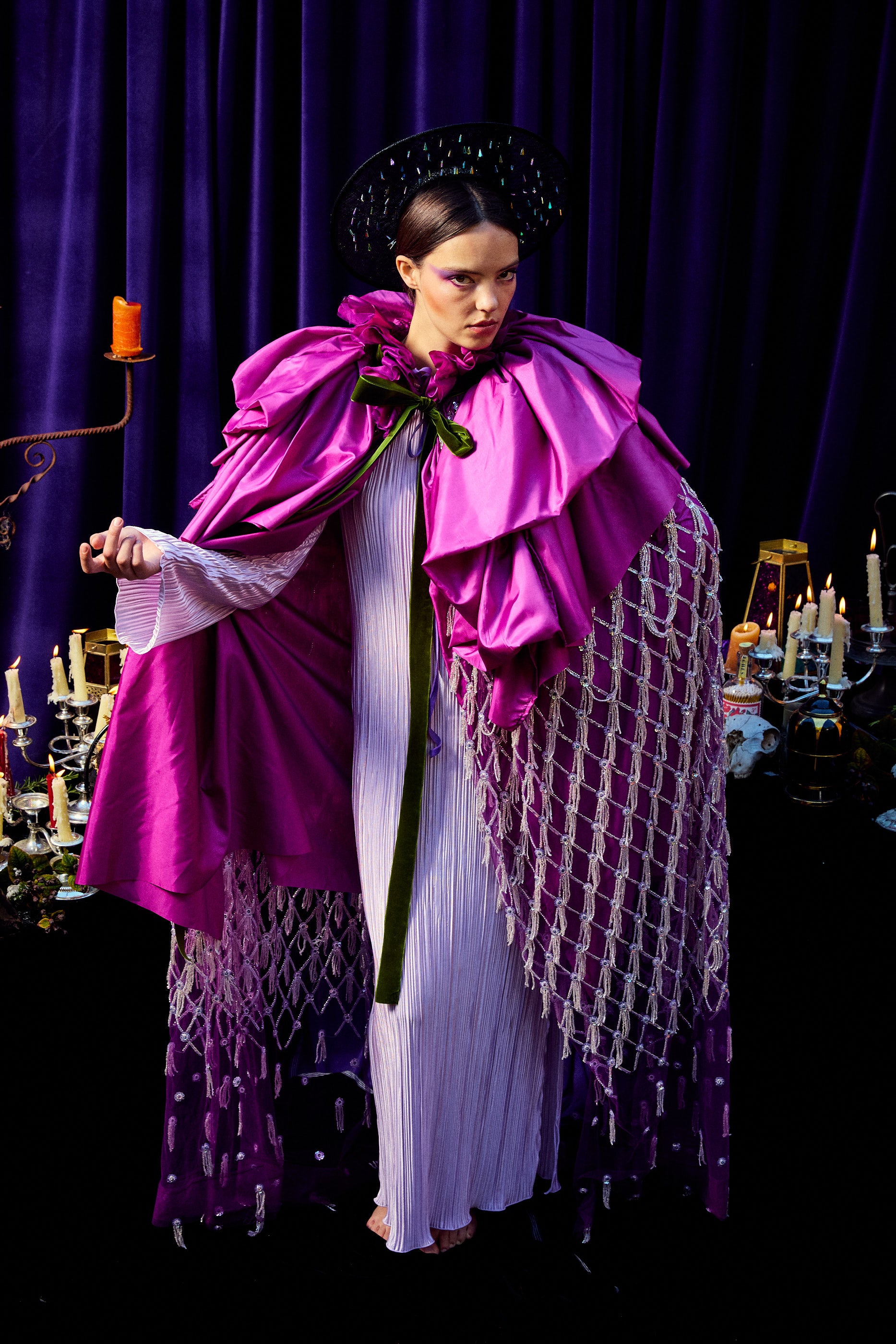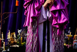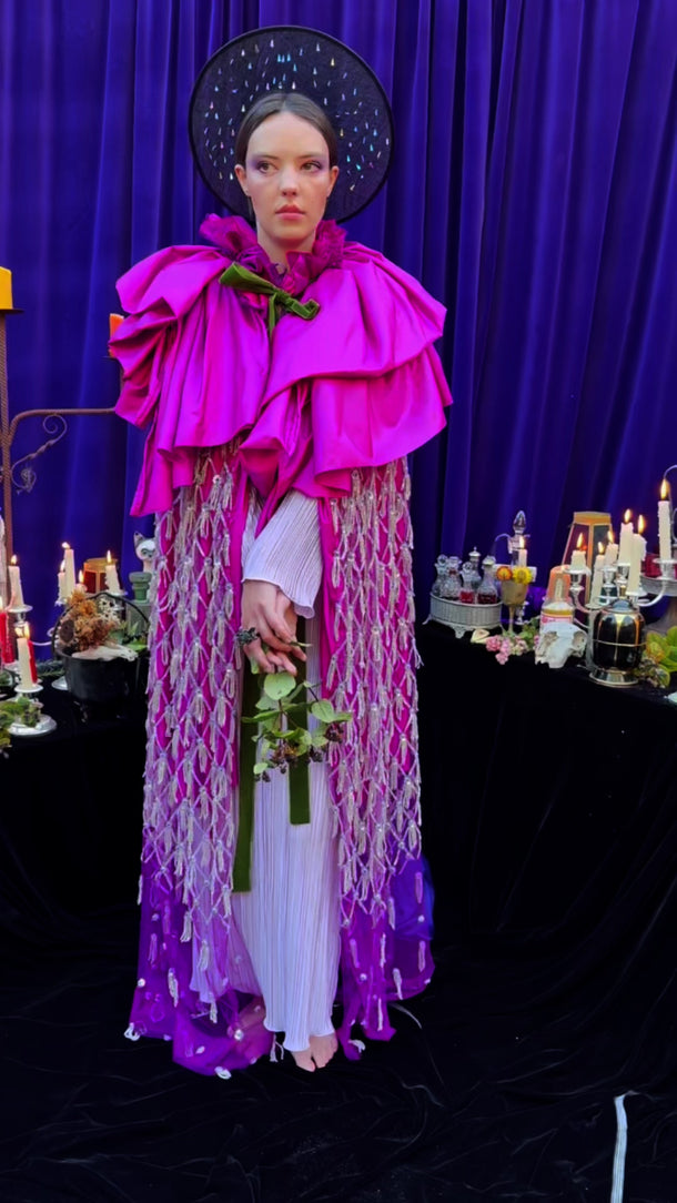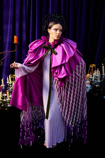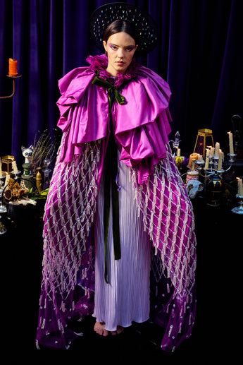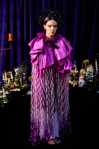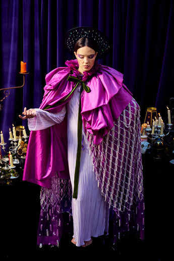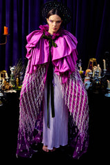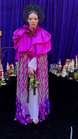 The Amethyst Veil Cape is crafted from layers of deep magenta satin and sheer beaded netting, creating a dramatic yet ethereal silhouette. The sculptural neckline and voluminous ruffles contrast with the fluid, embellished layers beneath, giving depth and texture to the design. Removable large ruff collar.