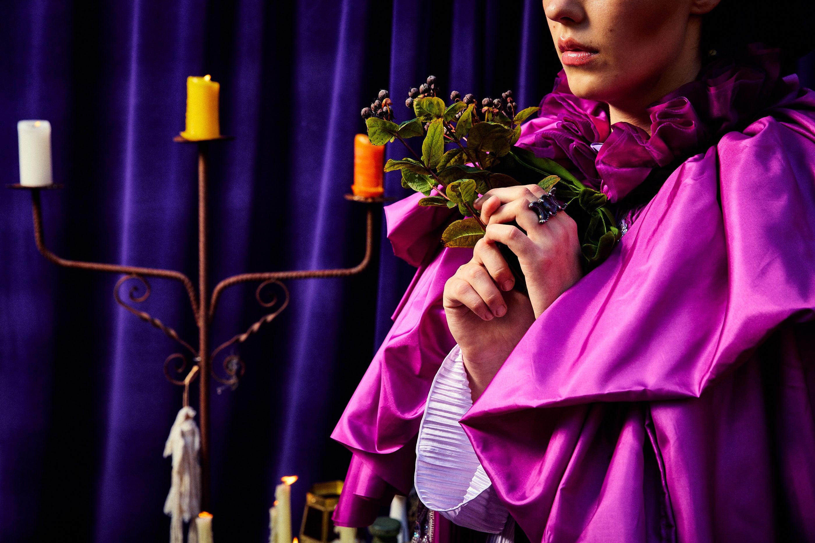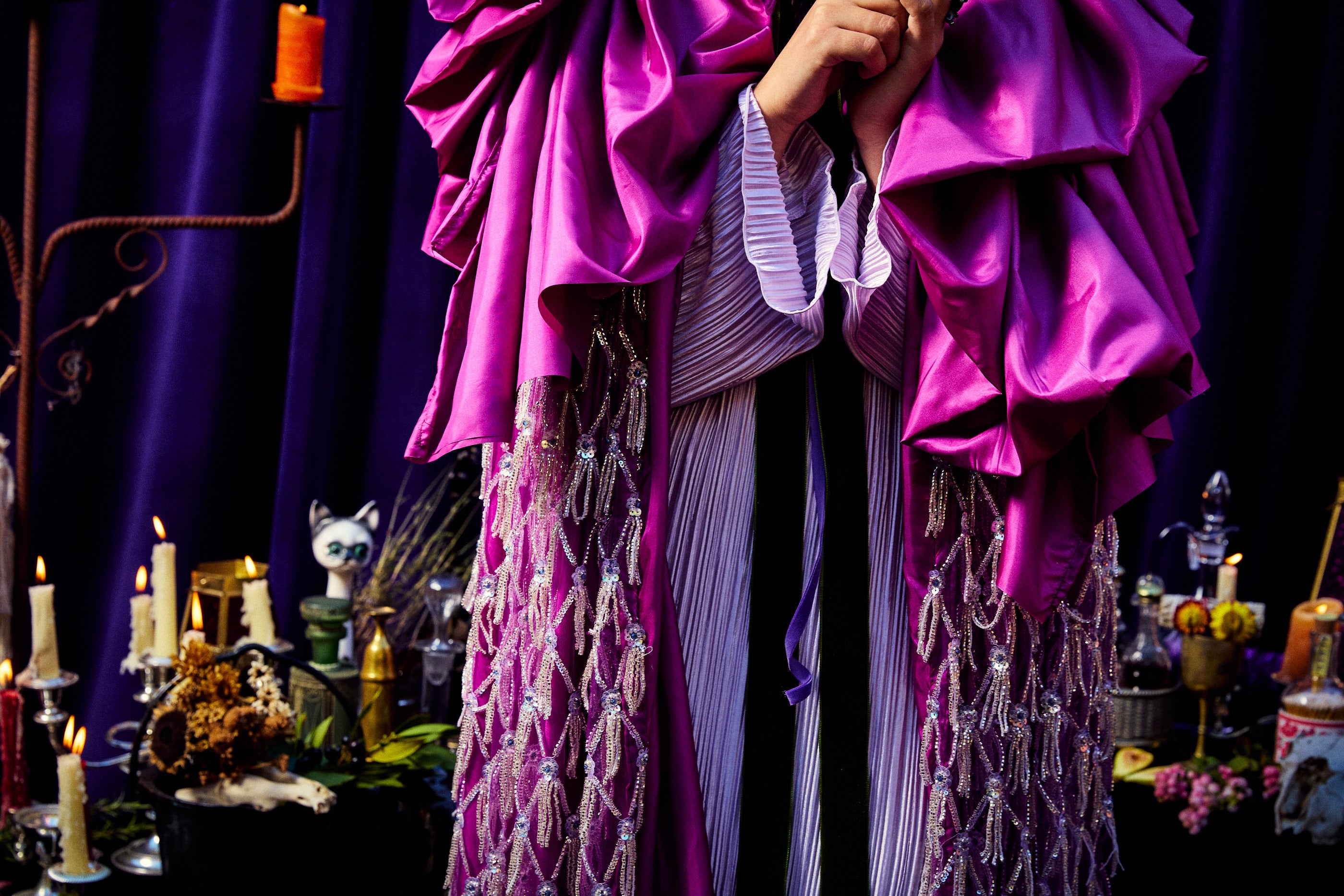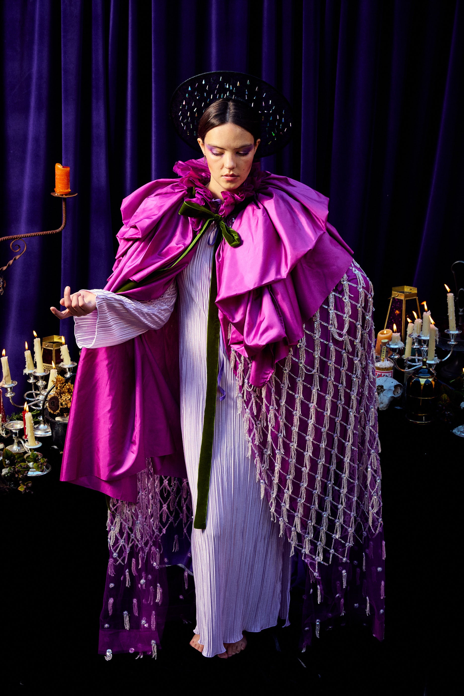 The Amethyst Veil Cape is crafted from layers of deep magenta satin and sheer beaded netting, creating a dramatic yet ethereal silhouette. The sculptural neckline and voluminous ruffles contrast with the fluid, embellished layers beneath, giving depth and texture to the design. Removable large ruff collar.