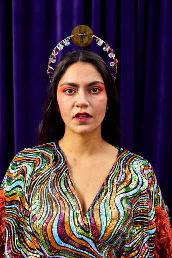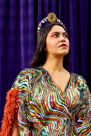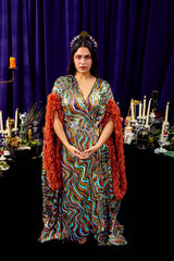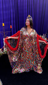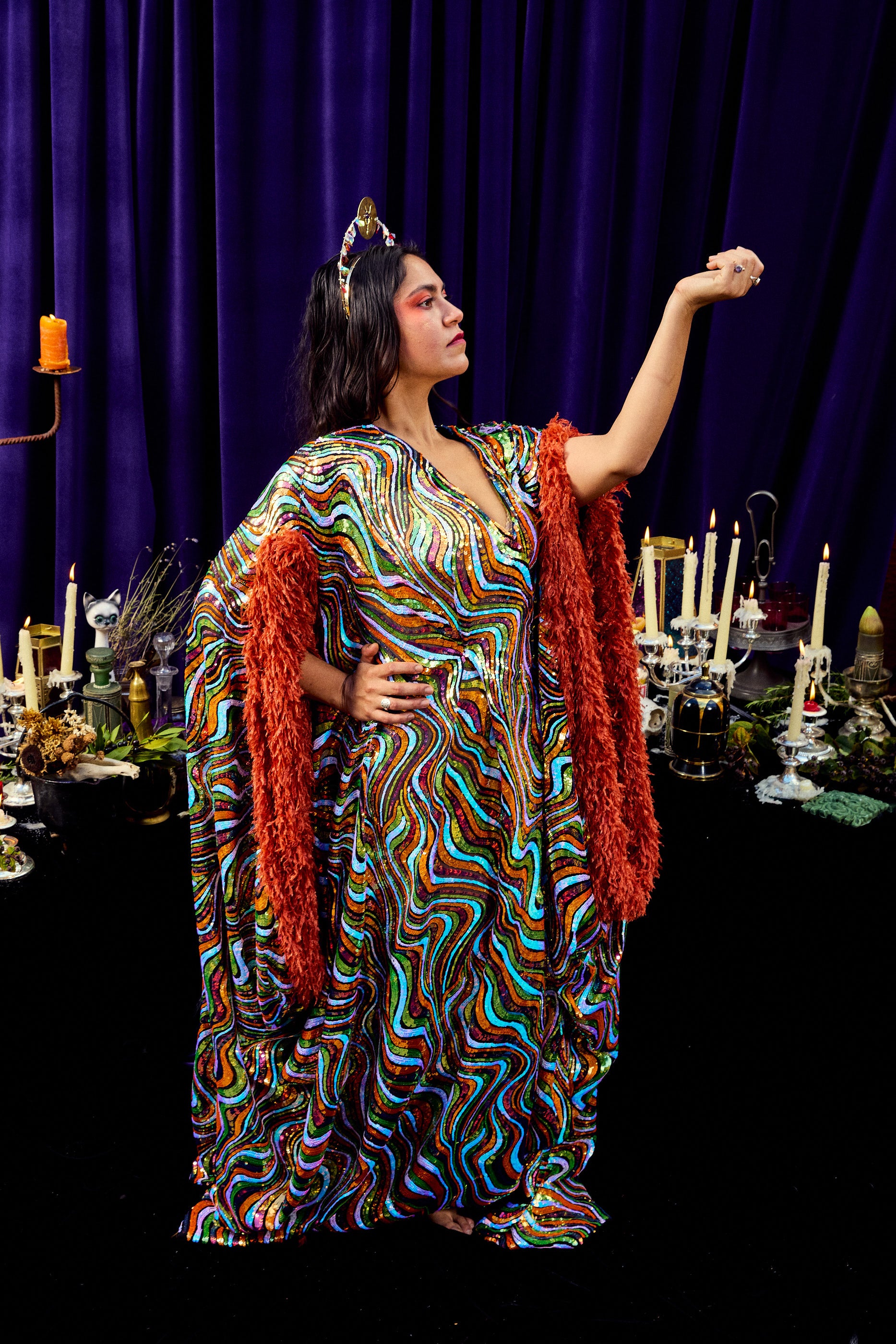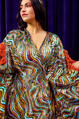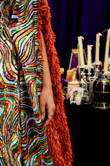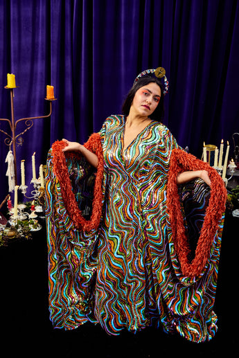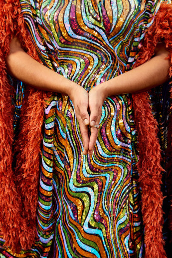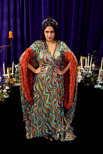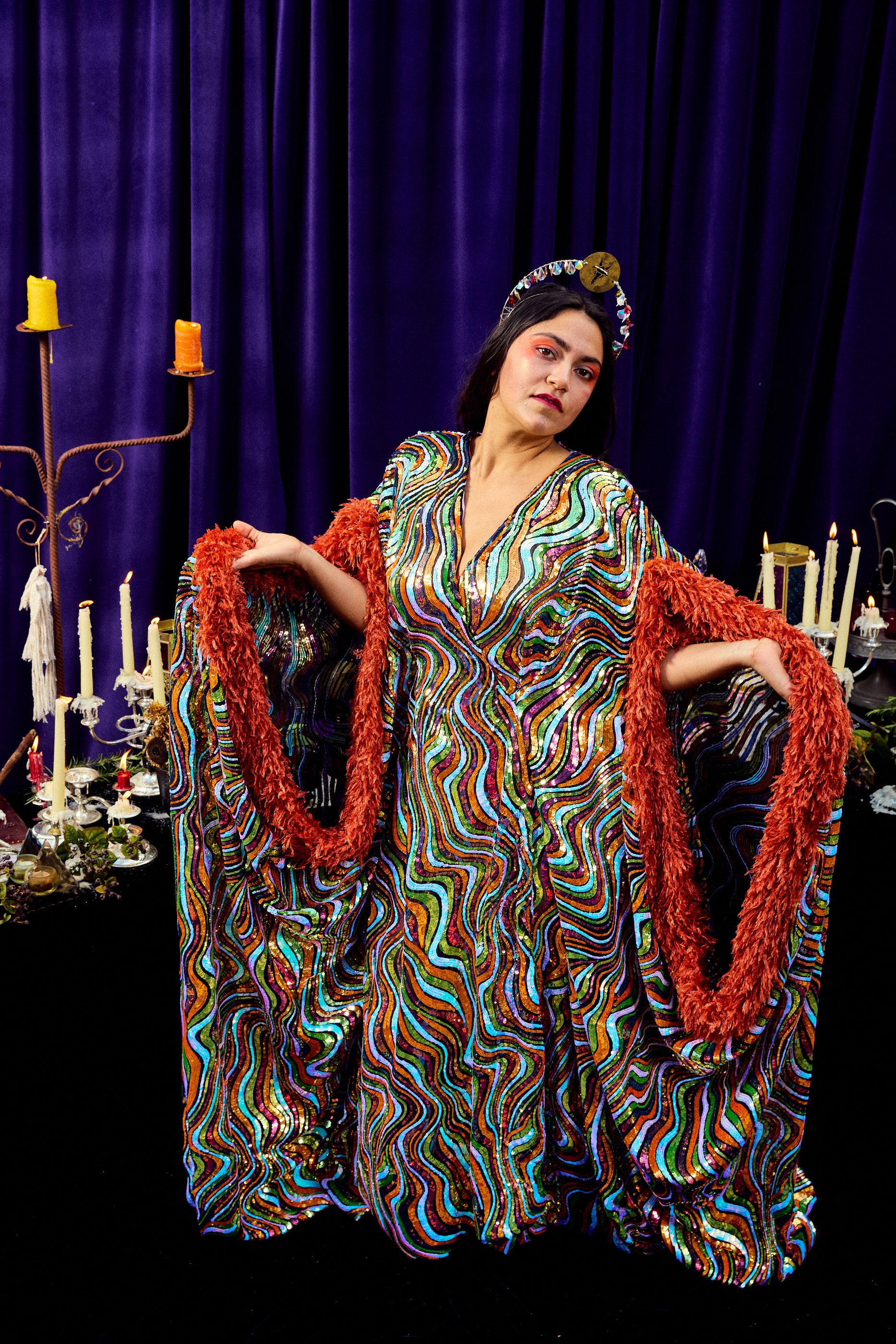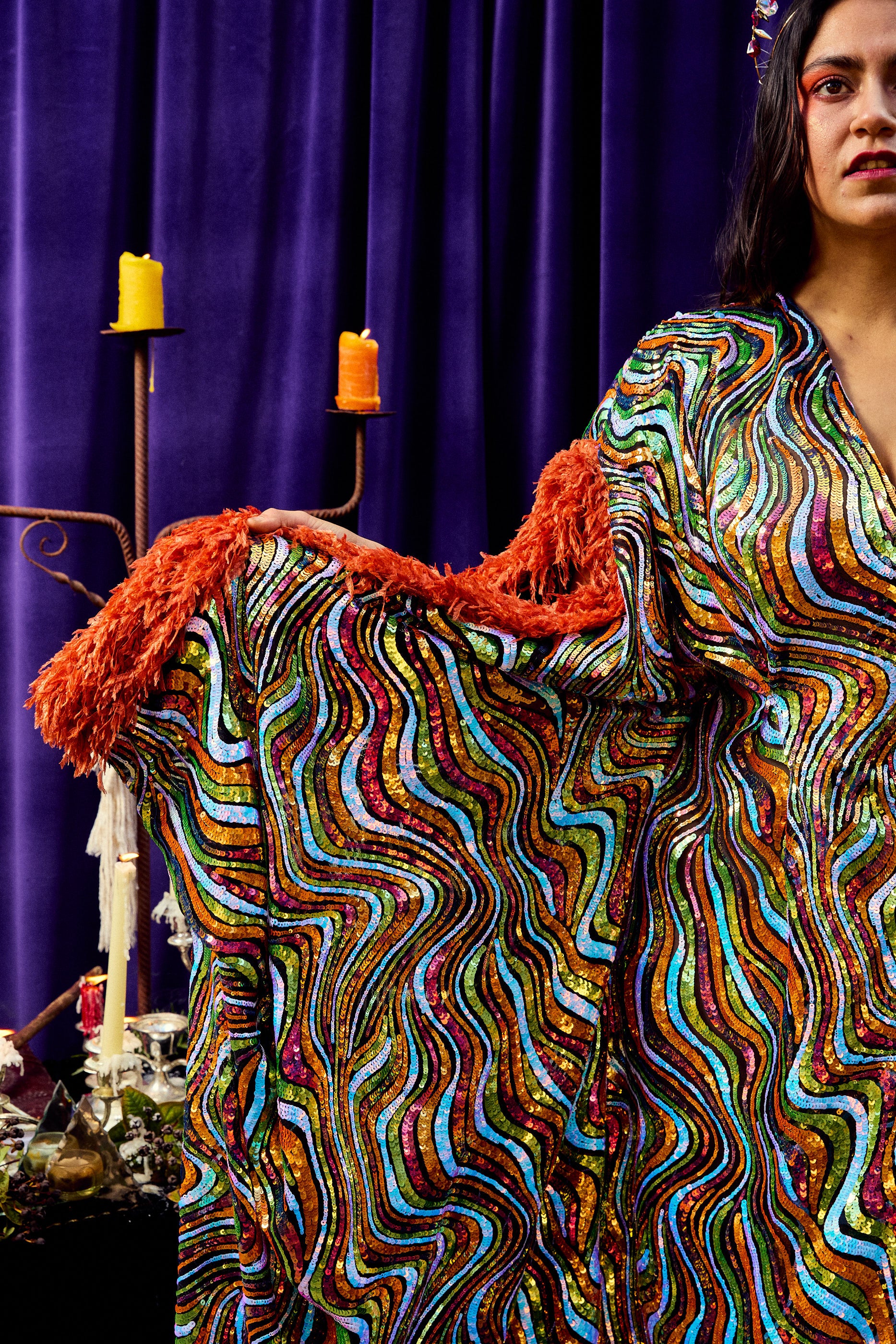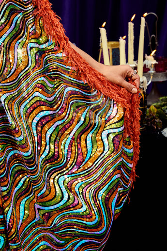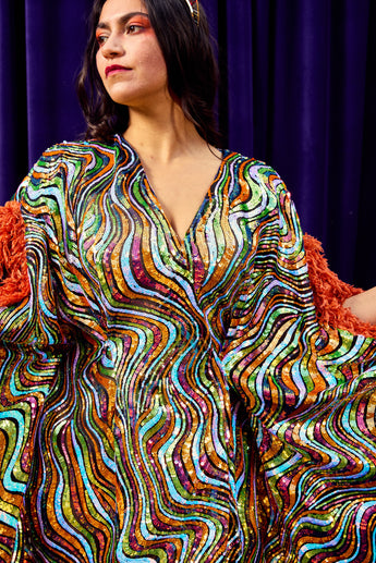 The Feverwave is a Sequin V-neck, double breasted Kaftan Gown, featuring a rainbow of lave fuelled iridescent waves of sequin shimmer. Framed by fiery orange tasselled trim on wide draping sleeves that move with each gesture. Finished with our signature hidden ribbons for adaptable styling.