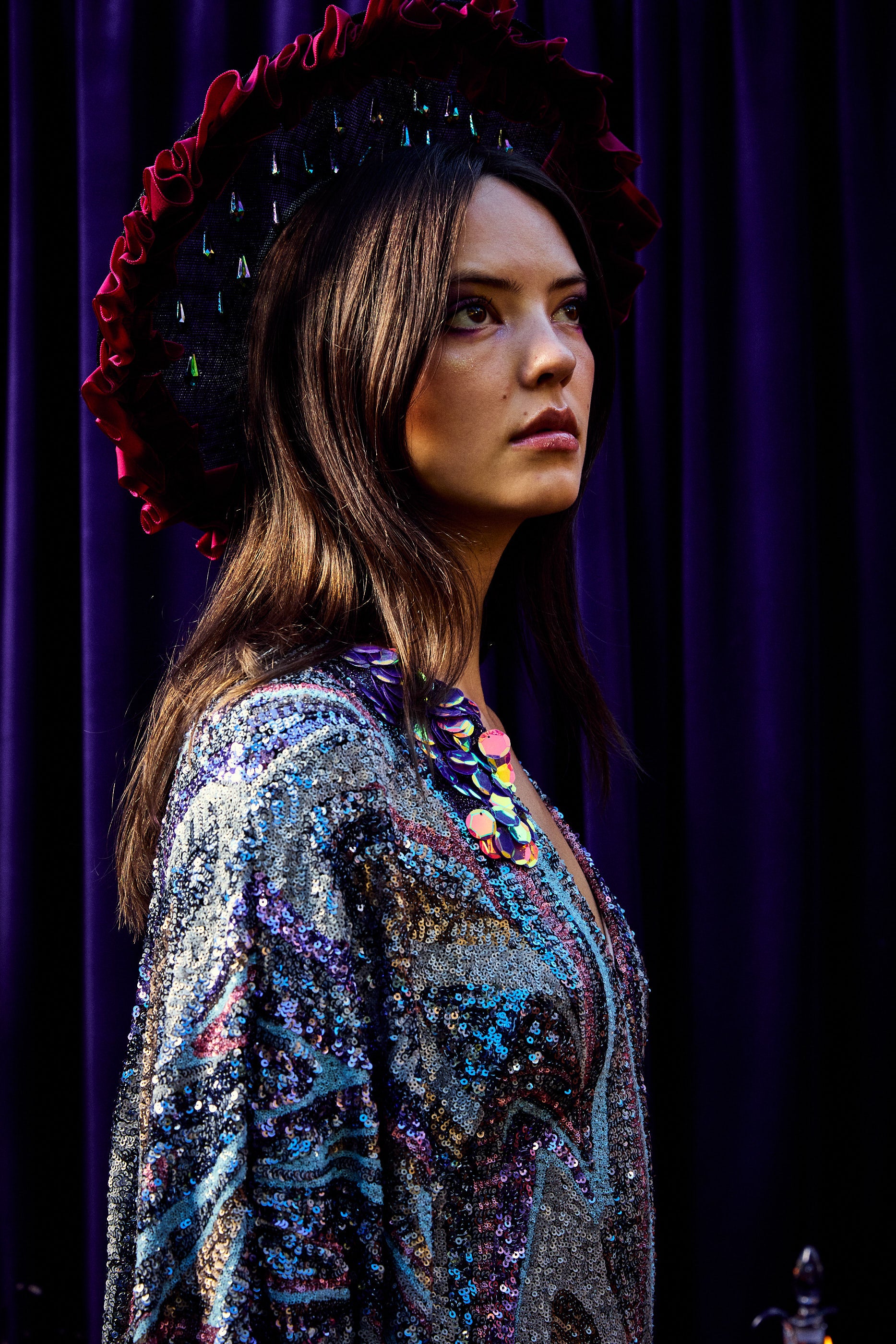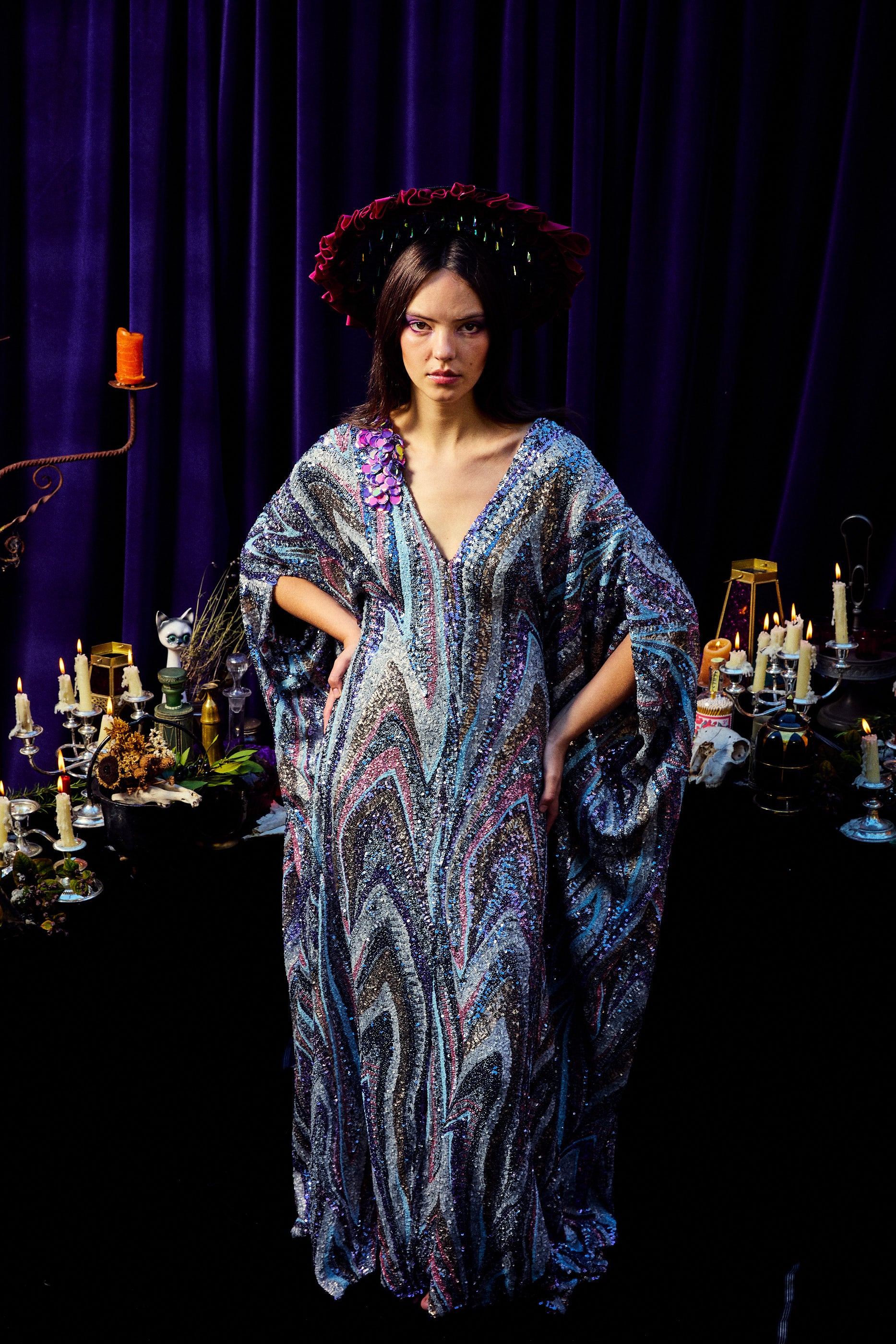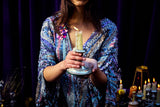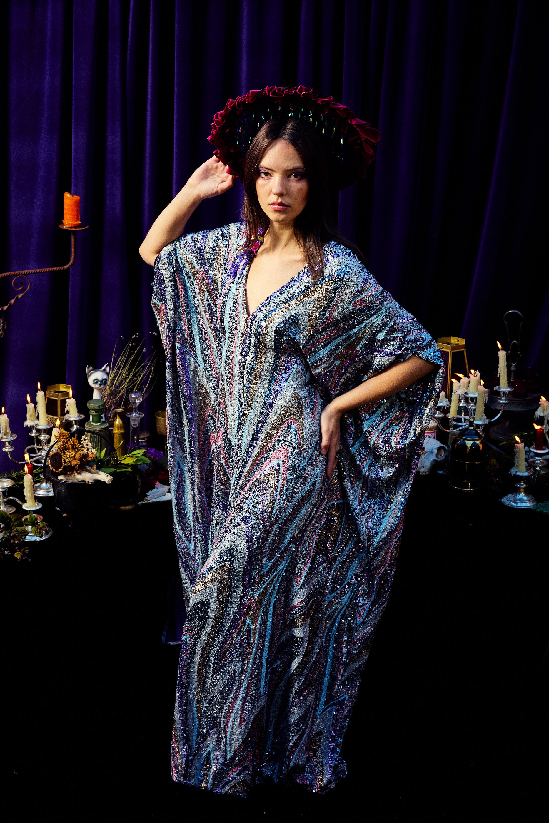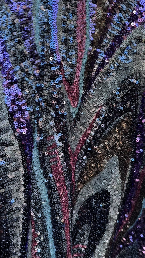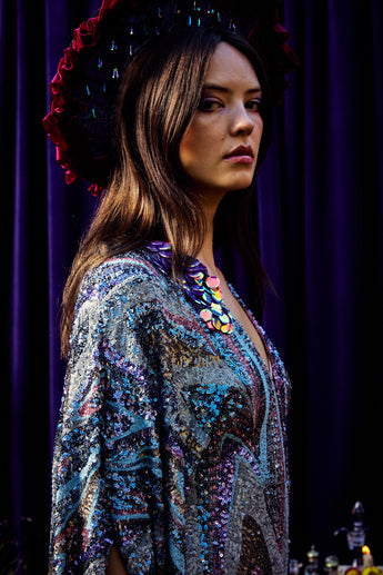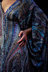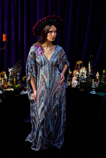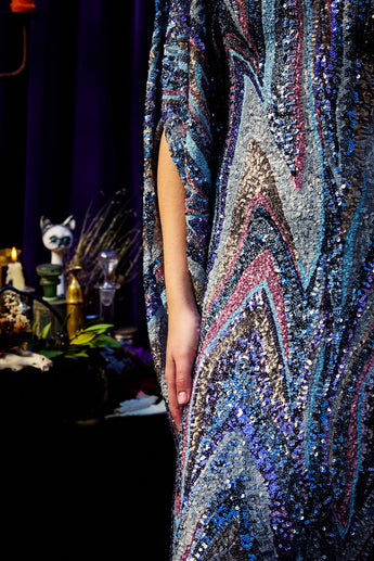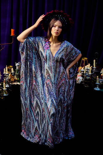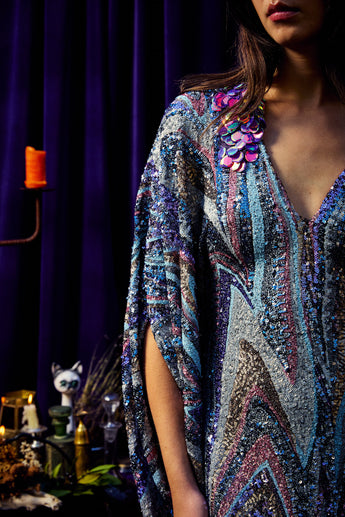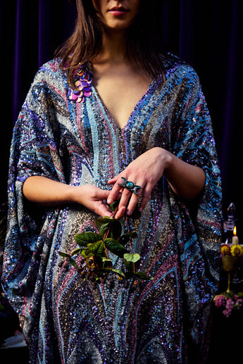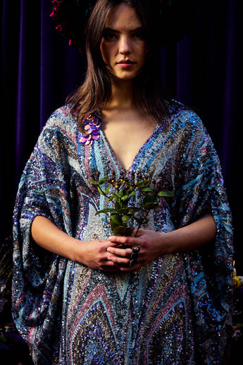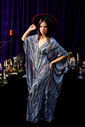 The Twilight Thread Kaftan Gown is made from a fluid sequin fabric with a marbled pattern in shades of lilac, silver, and deep blue. The lightweight construction drapes beautifully across the body, reflecting light with every movement. Finished with our signature hidden ribbons for adjustable styling.