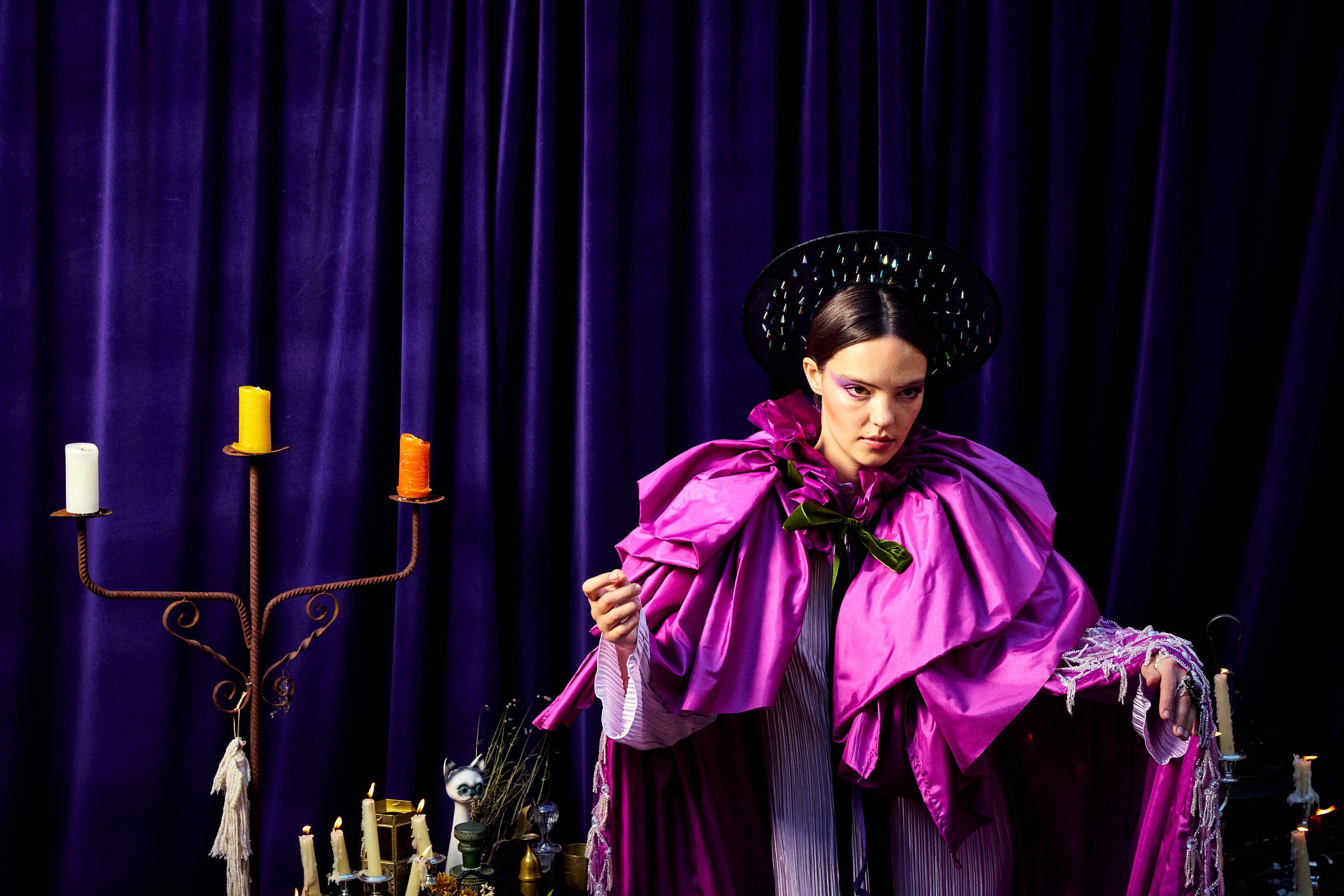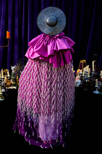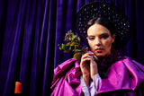 The Amethyst Veil Headpiece features an onyx black, wide, structured circular form - a round brim, a nod to the traditional withes hat. Finished with iridescent teardrop embellishments that catch the light with every movement.