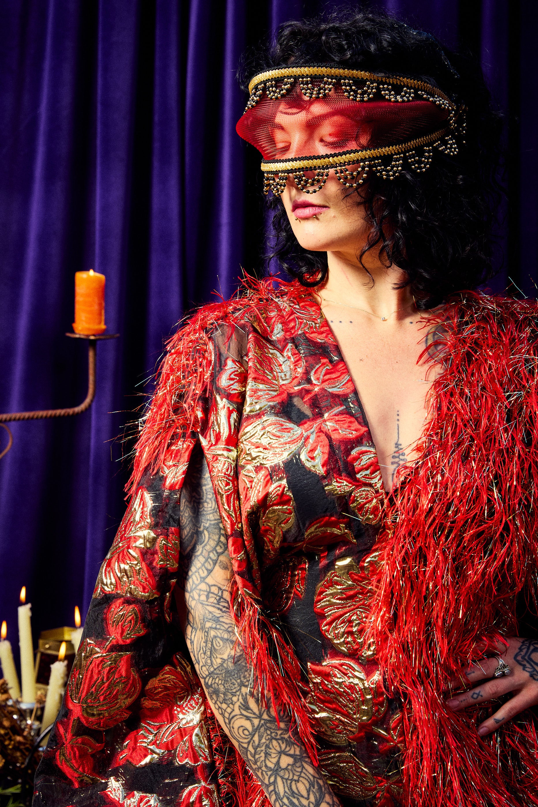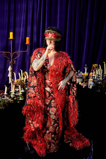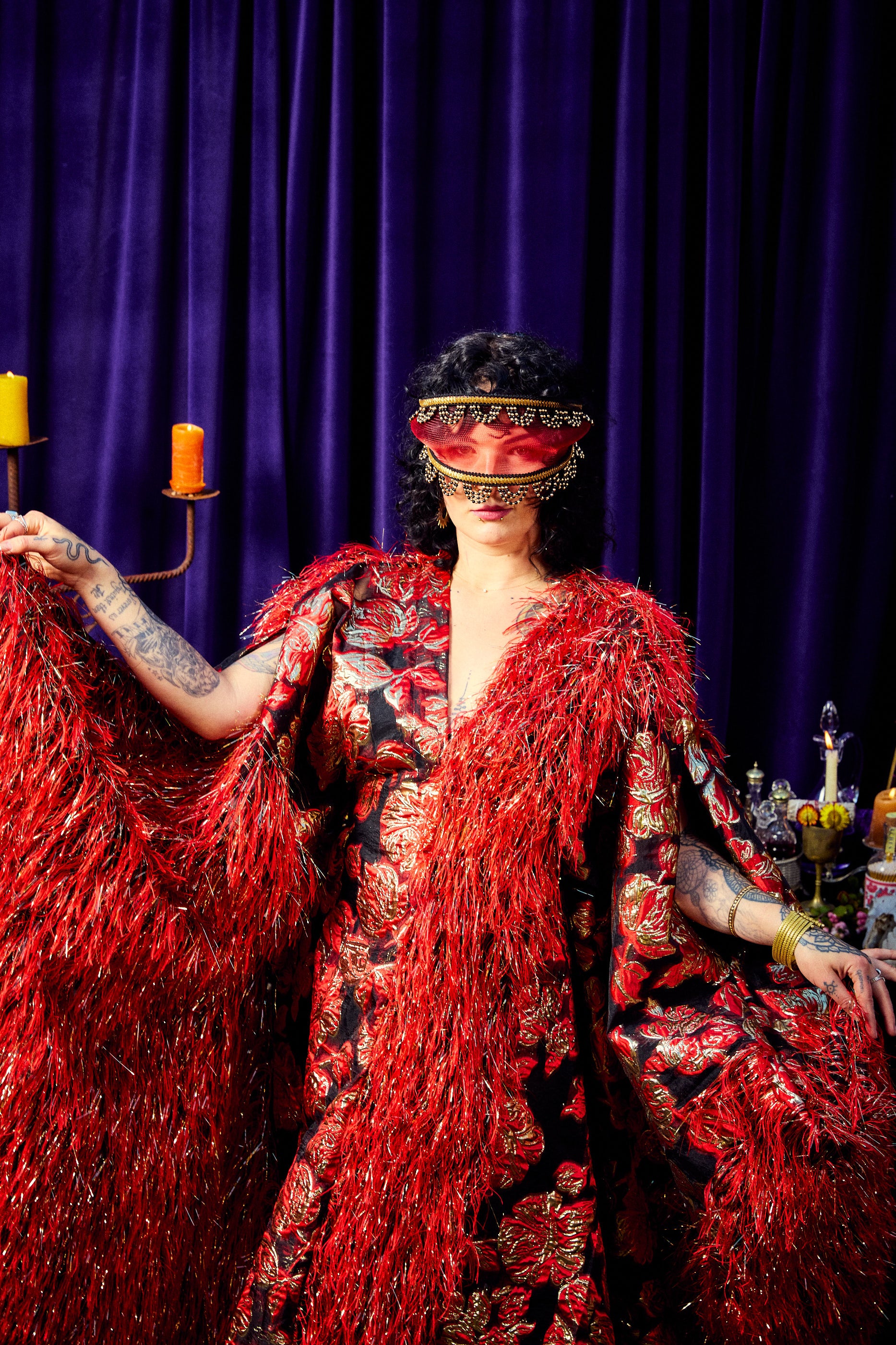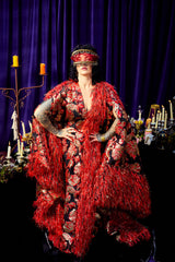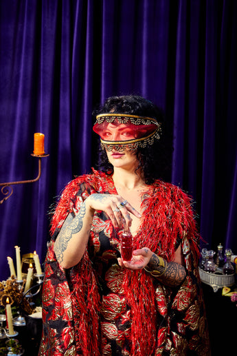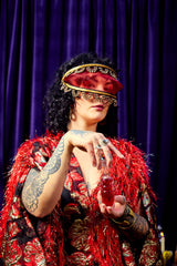 The Crimson Relic Headpiece features layers of rich red satin with beaded fringe detailing that catches the light with every movement. Designed to complement the Crimson Relic Kaftan Gown, it adds a bold, dramatic finish to the look.