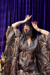 The Elder Veil Headwear features layered black netting adorned with draped chains and crystal details. Designed to frame the face and catch the light with subtle movement, it adds a statement finish to any look from the Threads collection.