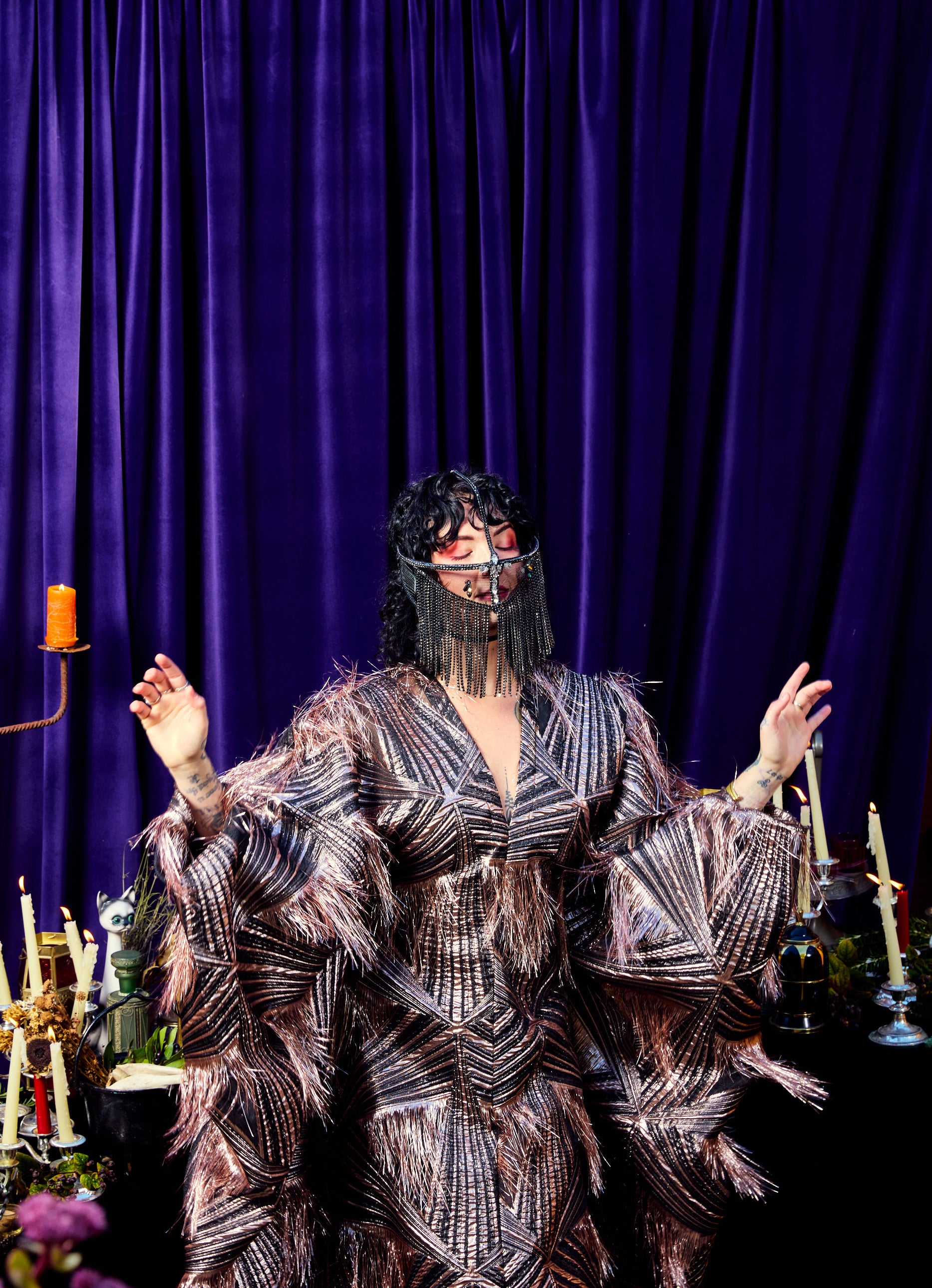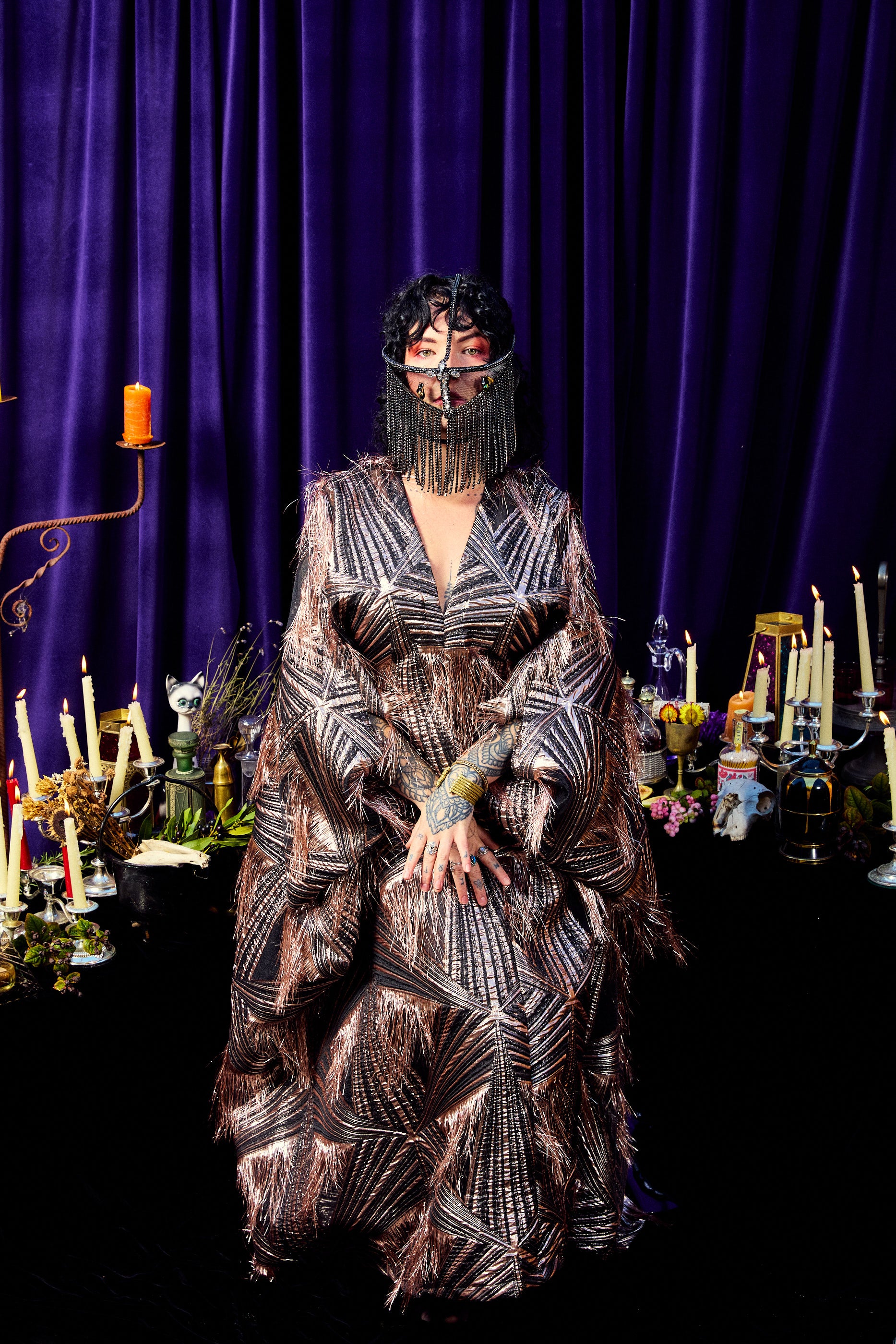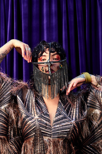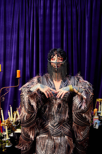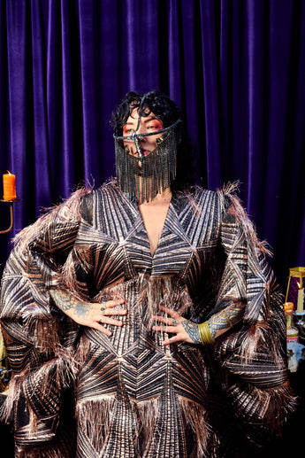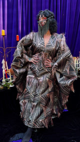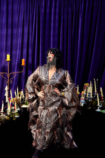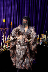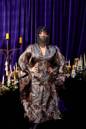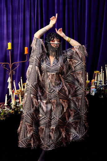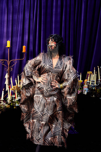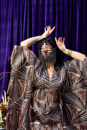 The Elder Veil Kaftan Gown is made from a metallic jacquard fabric with a geometric pattern and subtle copper shimmer. Fringed detailing adds movement and texture, creating a statement look that catches the light from every angle. Finished with our signature hidden ribbons for flexible styling. Please note this is a medium to heavyweight fabric with a structured drape.