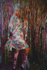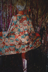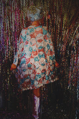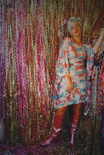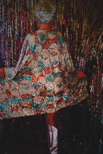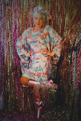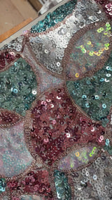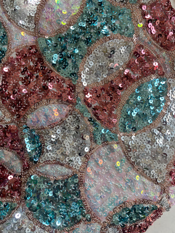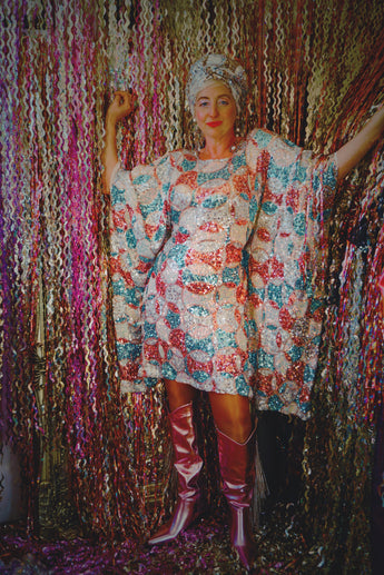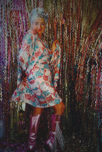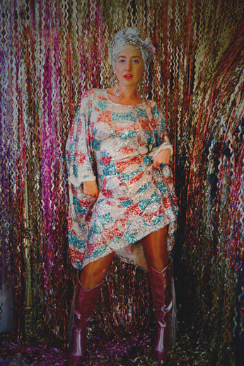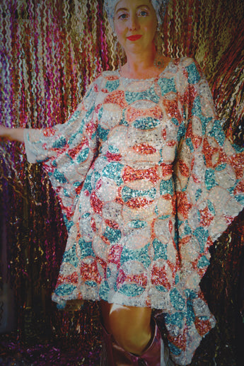 Beautiful luxe sequinned mesh stretch mini kaftan featuring a pink, blue, and white circle pattern.