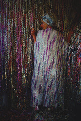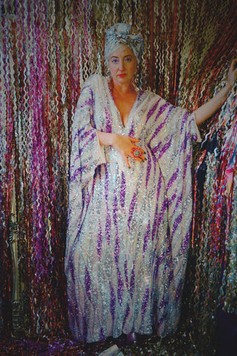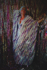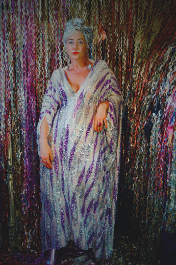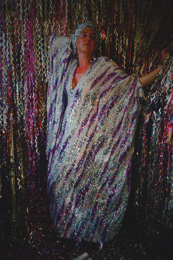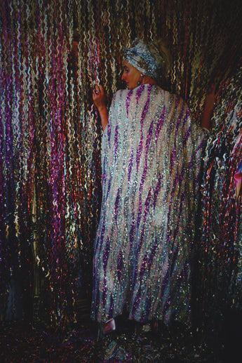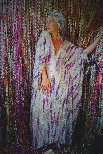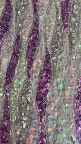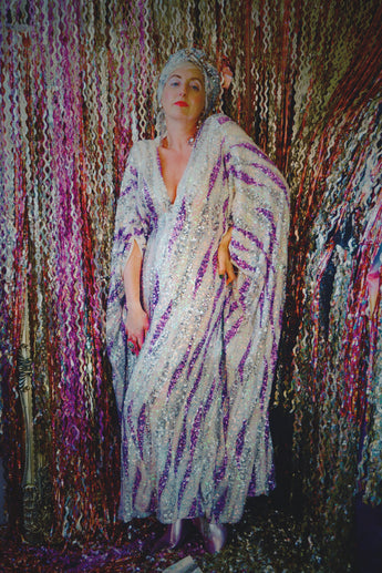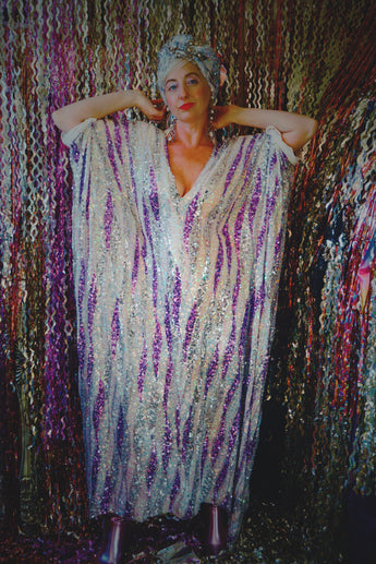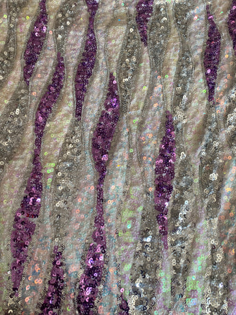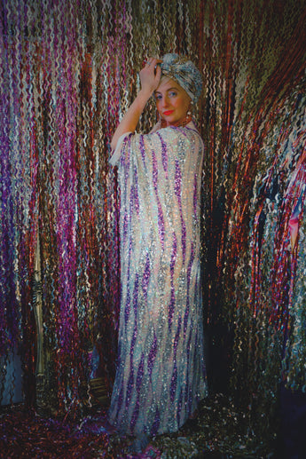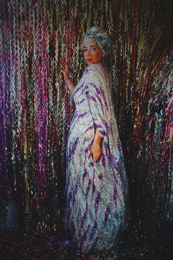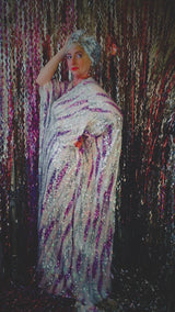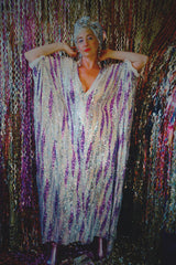 Luxe Mesh stretch Sequin purple, silver, and white v-neck maxi dress kaftan. Choose from a side thigh-high split or standard gown style (standard style pictured).