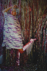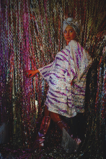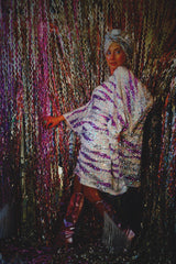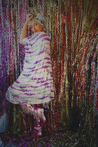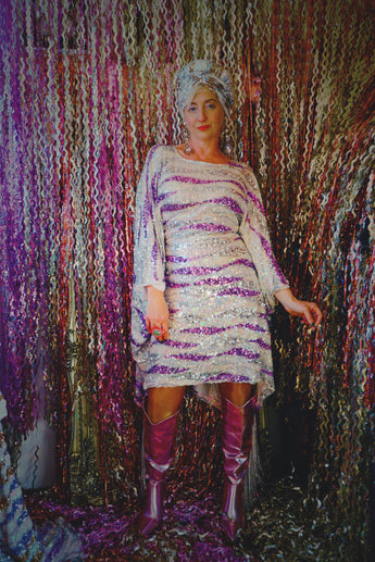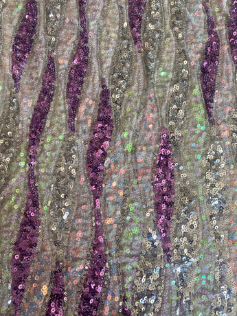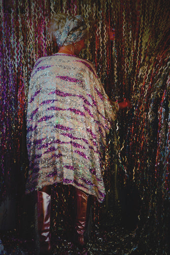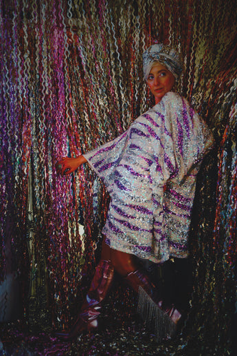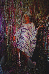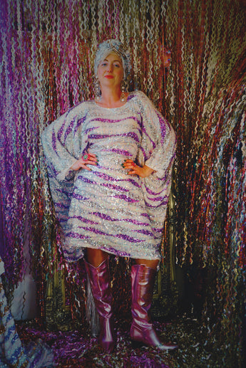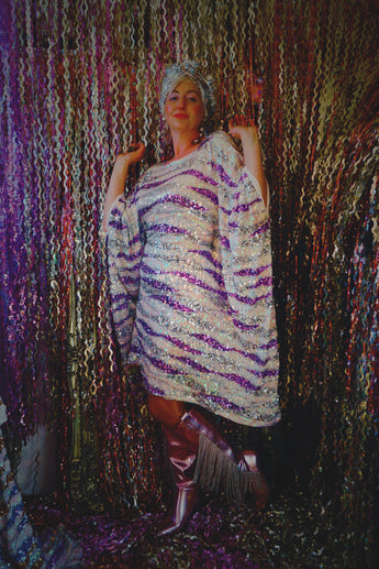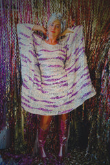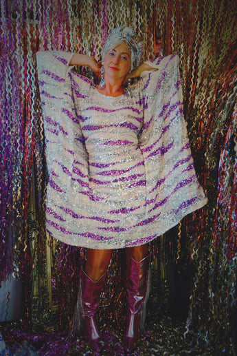 Beautiful sequinned mini kaftan featuring a purple, silver, and white wave pattern.