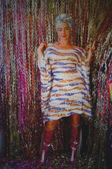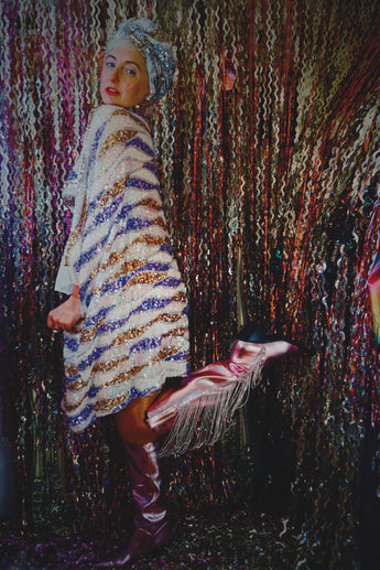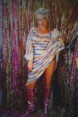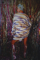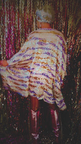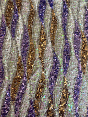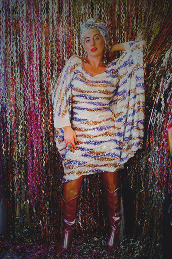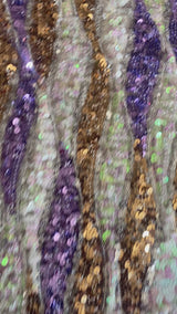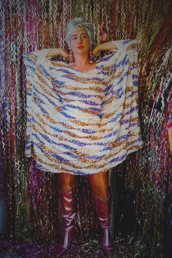Beautiful luxe sequinned mesh stretch mini kaftan featuring a purple, white and gold wave pattern.