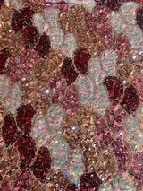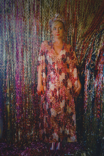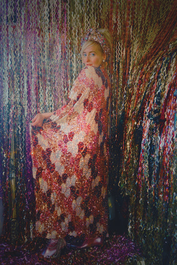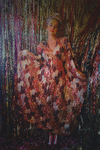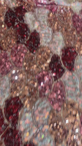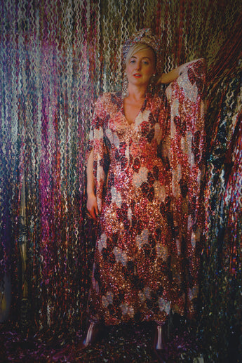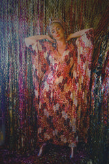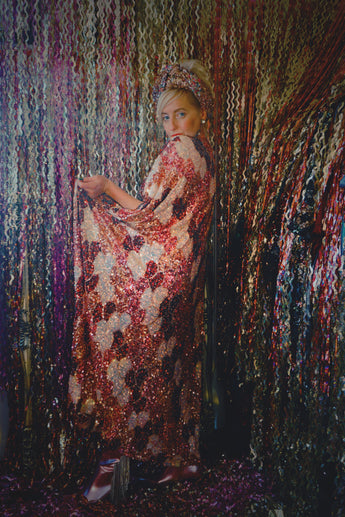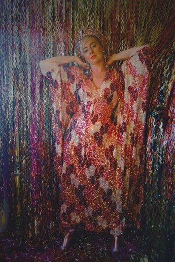 Luxe Mesh stretch Sequin red, pink and white jewel pattern v-neck maxi dress kaftan. . Choose from a side thigh-high split or standard gown style (standard style pictured)