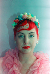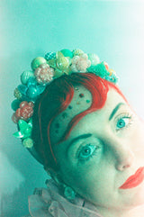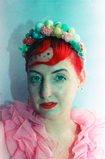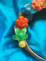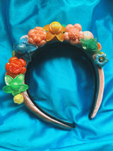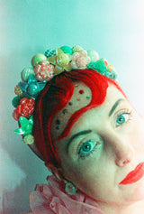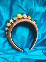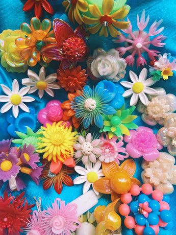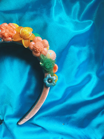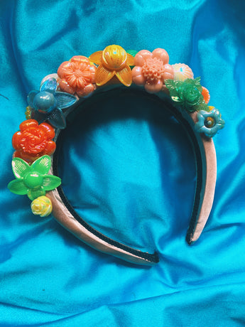 A super cute and kitsch padded pale pink alice band adorned on both sides with vintage 50s flowers taken from hair bobbles and hair clips. All in different colours and some with a pearly sheen.