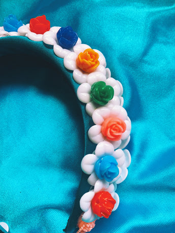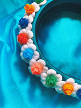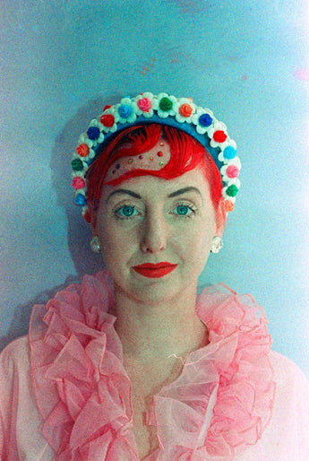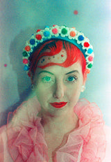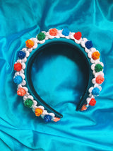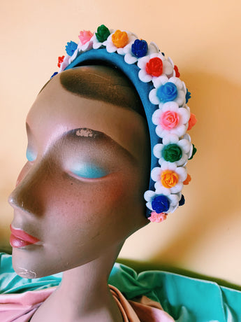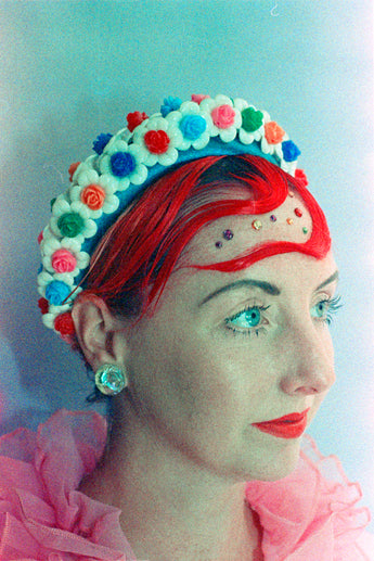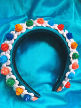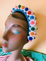 Super kistch headband made from repurposed 60s hair bobbles. Secured on a padded alice band and matching front and back.