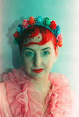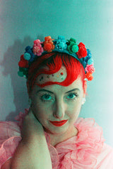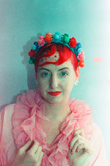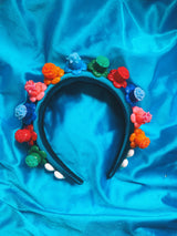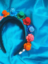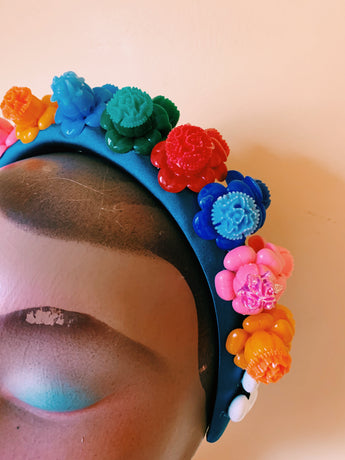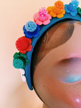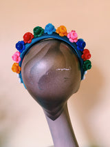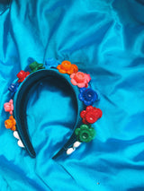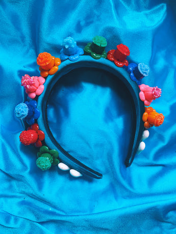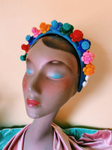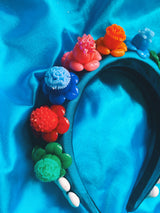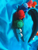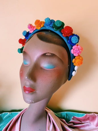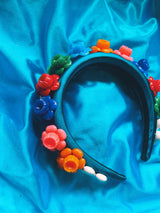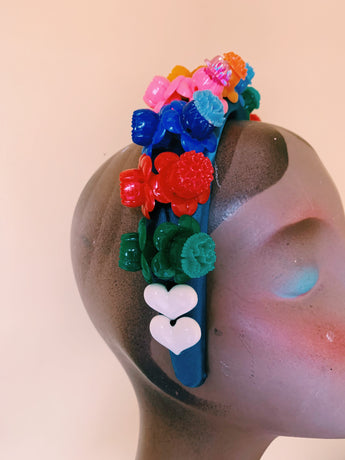 Super kistch headband made from repurposed 60s flower and heart shaped hair bobbles in a range of colours. The Adornments run all the way along a padded blue alice band base, front and back. One side has plain flowers, the other has additional embellishments added to the centre of the flowers (see photos).