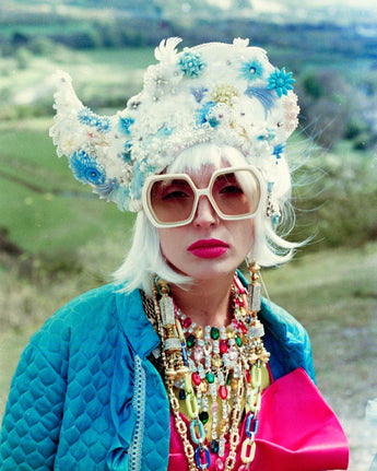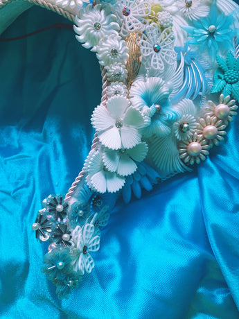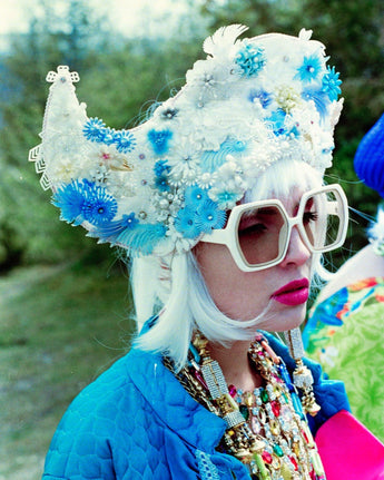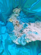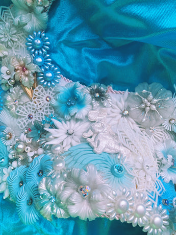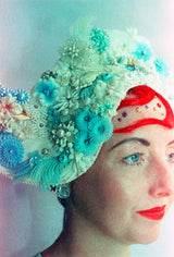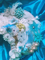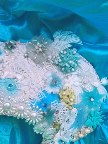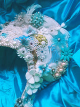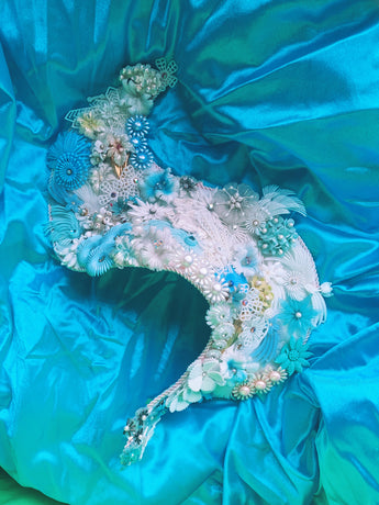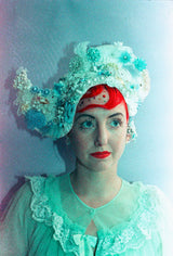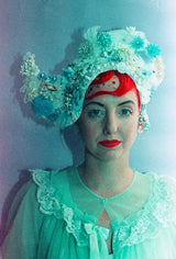 One of a kind crown smothered from tip to tip from vintage 50s plastic earrings (approx 100!) which adorn a stiffened white sculpted base. The earrings themselves are a rare find, and it takes much precision and time in designing and making the piece which reflects in its price.