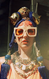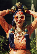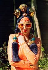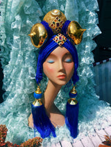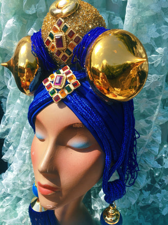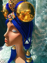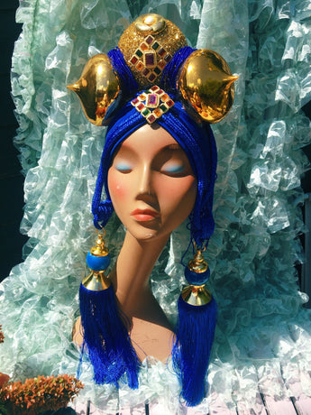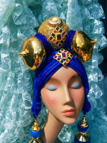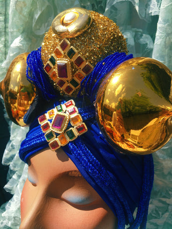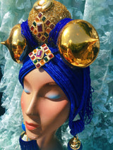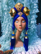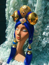 Bespoke Blue and Gold Bejewelled Turban Tassel Headpiece