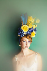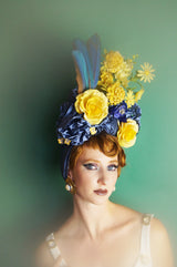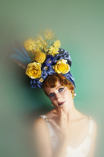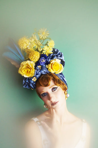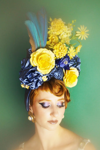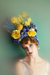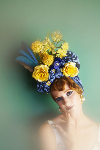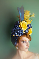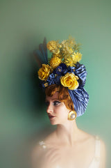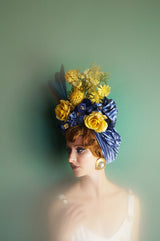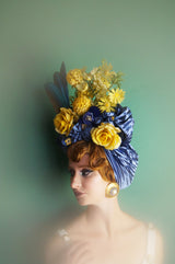 Blue and Yellow Vintage pleated Flower hat Turban with feathers