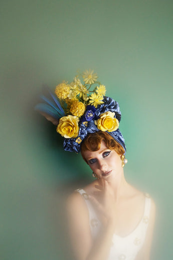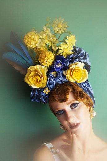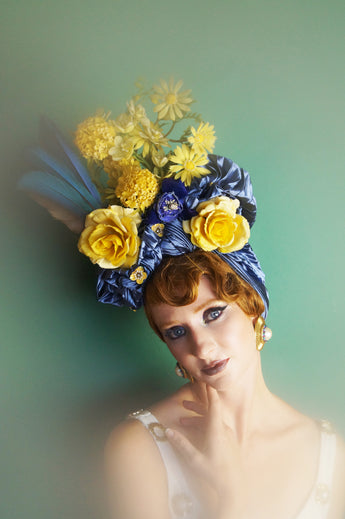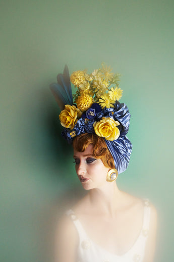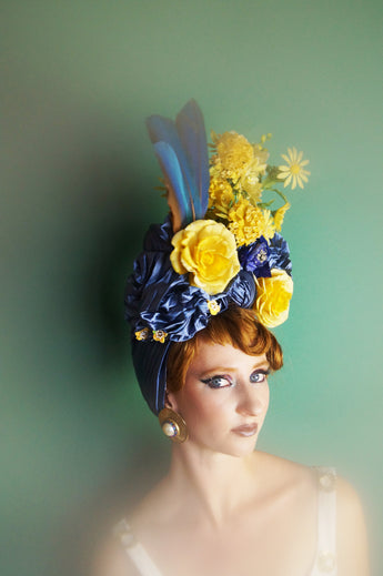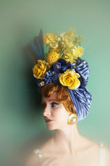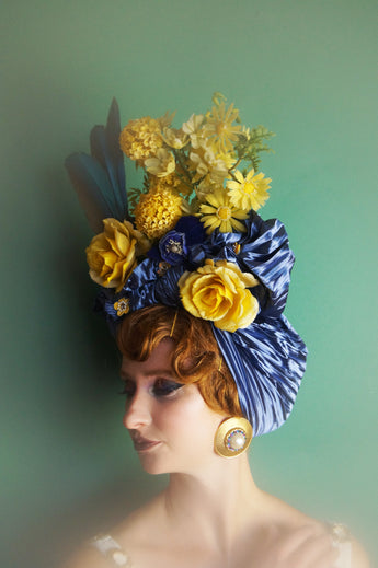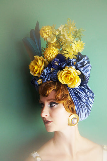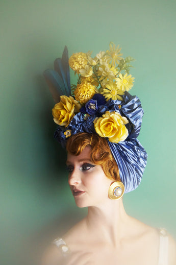 Handmade turban from a satin pleated fabric with added vintage millinery flowers, and feathers in Blues and yellows. All handstitched folds and knots to give the turban a unique design. Hand Stitched and Fully Lined.