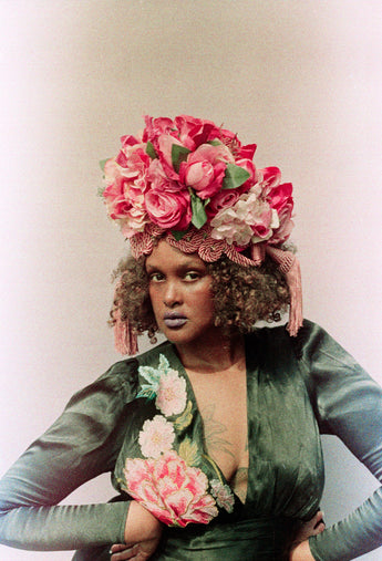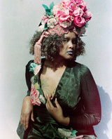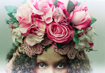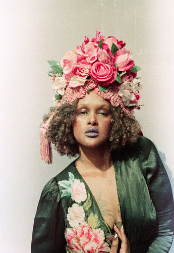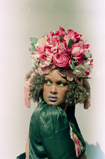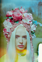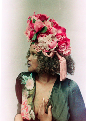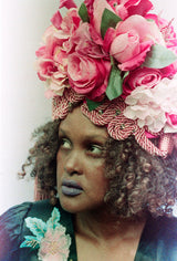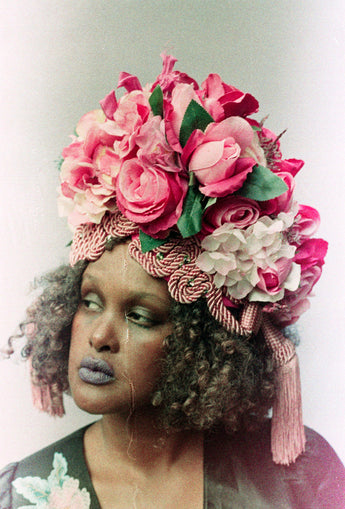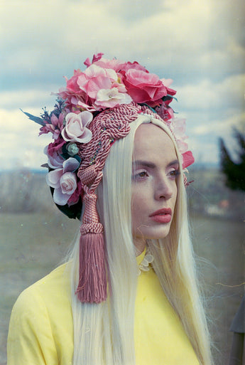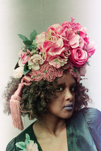 Statement Floral Turban headdress with vintage bejewelled flowers and intricate braiding with vintage cord and tassels. Can be worn further forward or back on the head as seen in photos. Flowers are on a pink stretch Turban base and elasticated to fit any head size.