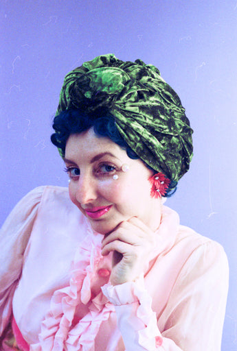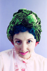 Olive green crushed velvet stretch twist front turban. *Small / tight sized fit.