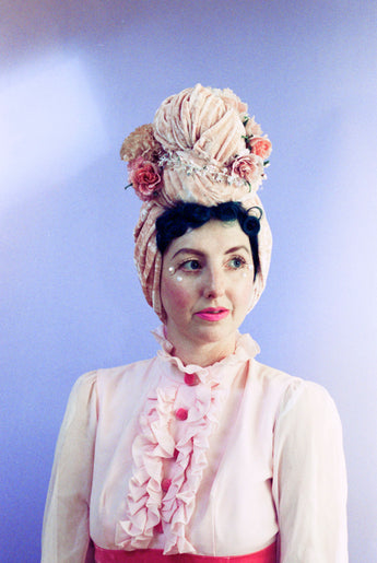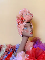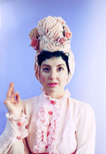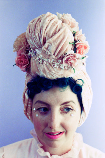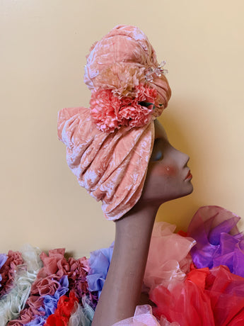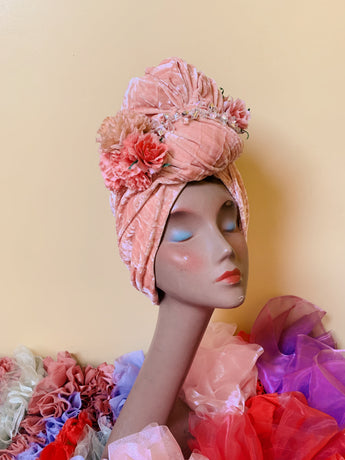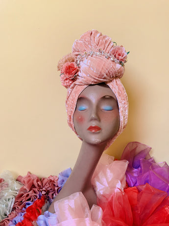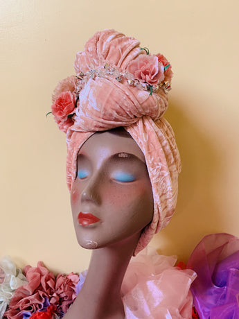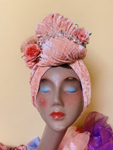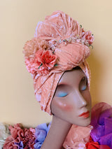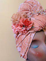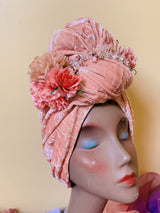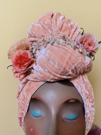 Pale pink thick luxury crushed velvet top knot turban. All hand-stitched into place with adding vintage flowers and iridescent trim. Heavy piece due to amount of fabric and height and bulk of the knot.
