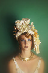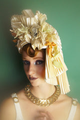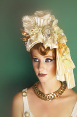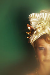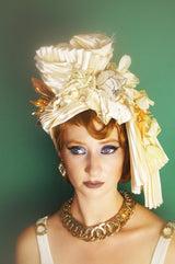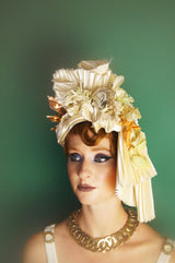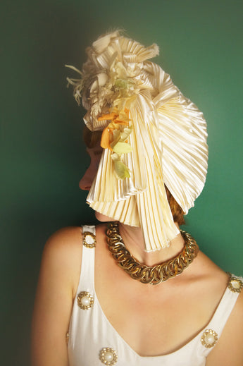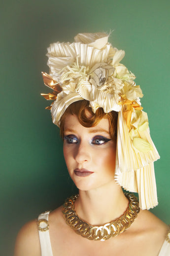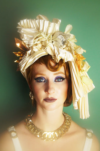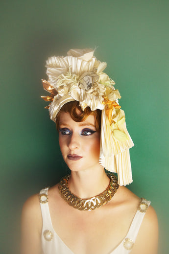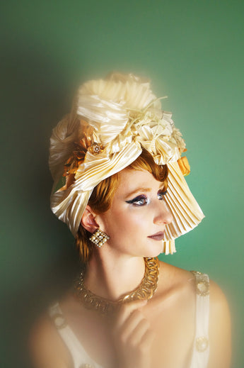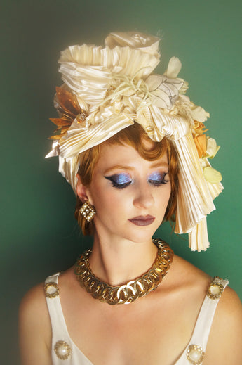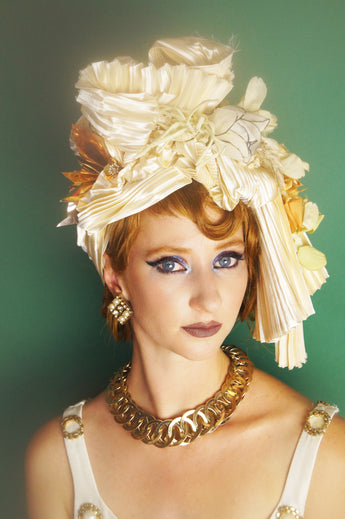 Handmade turban from a satin pleated fabric with added vintage millinery flowers, and origami Gold segmants. All handstitched folds and knots to give the turban a unique design. Hand Stitched and  Fully Lined.