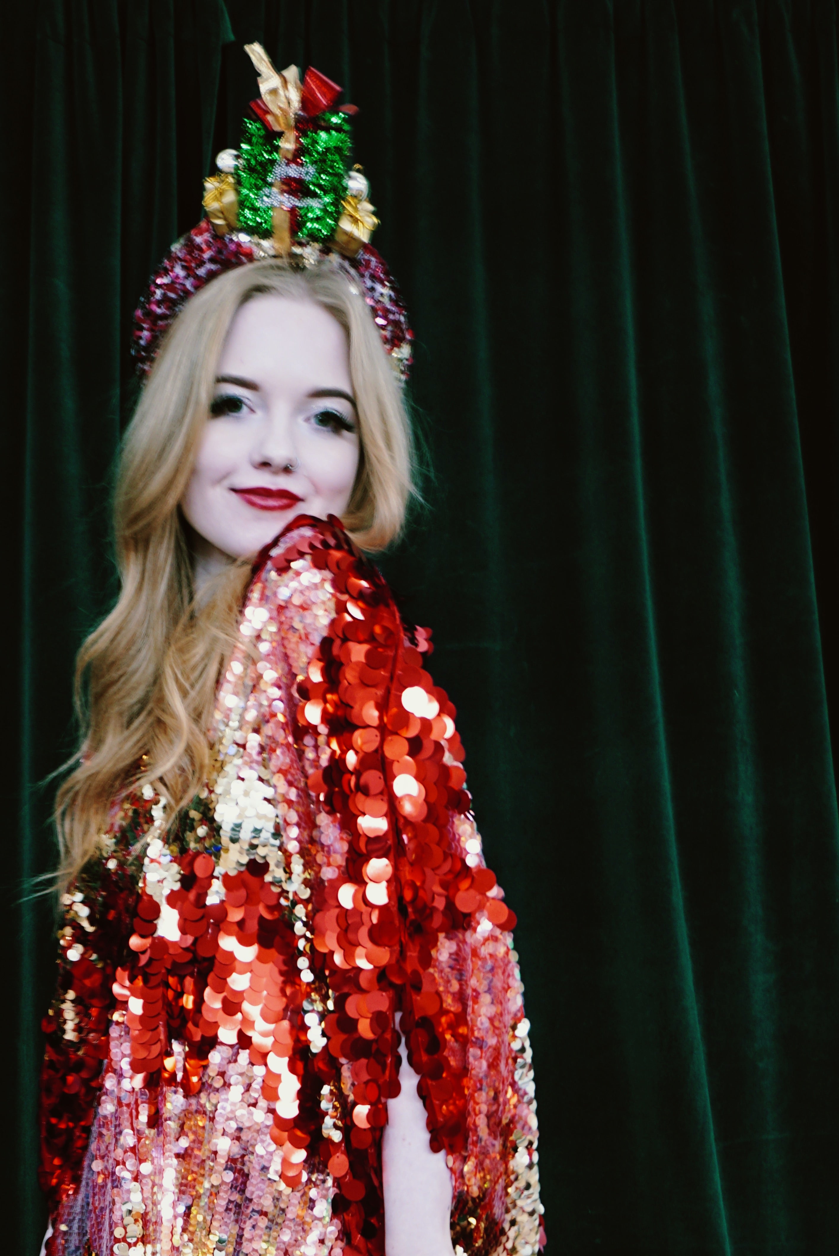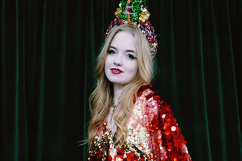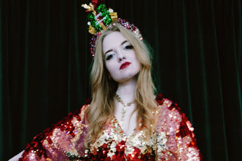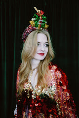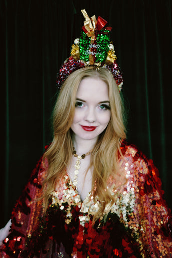 Crown yourself the Queen of Christmas with The Gift Goddess Crown. A gloriously over-the-top headpiece stacked high with glittering presents and festive sparkle and decorated with tinsel, baubles, and ribbons.