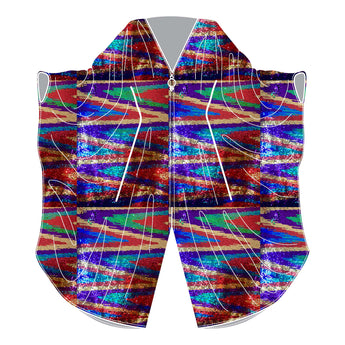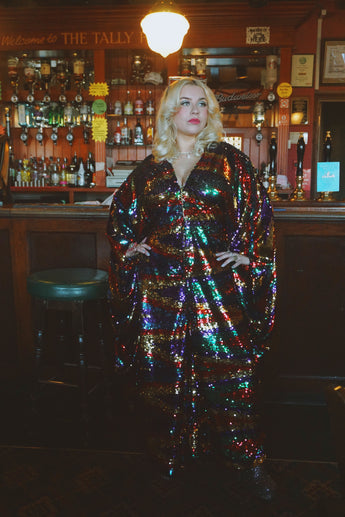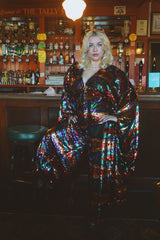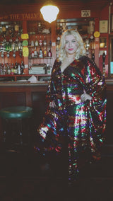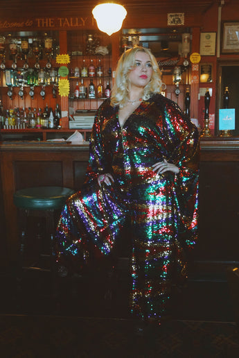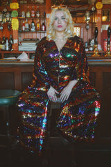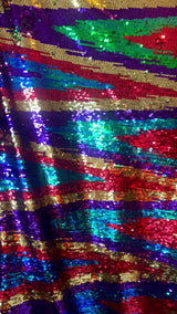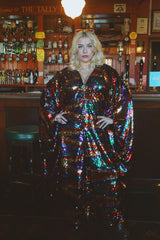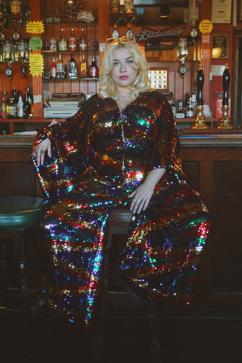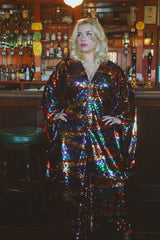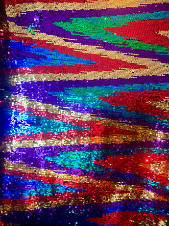 Beautiful sequinned Ziggy v-neck jumpsuit featuring a green, red, purple and gold zig-zag pattern.