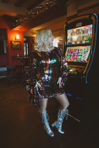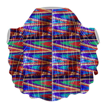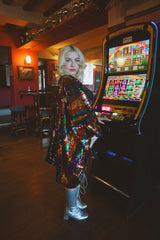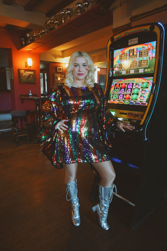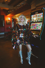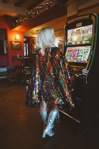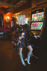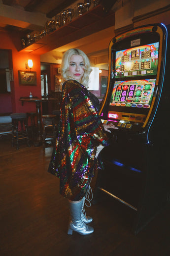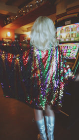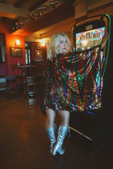 Beautiful sequinned Ziggy mini kaftan featuring an green, red, purple and gold zig-zag pattern.