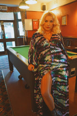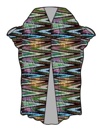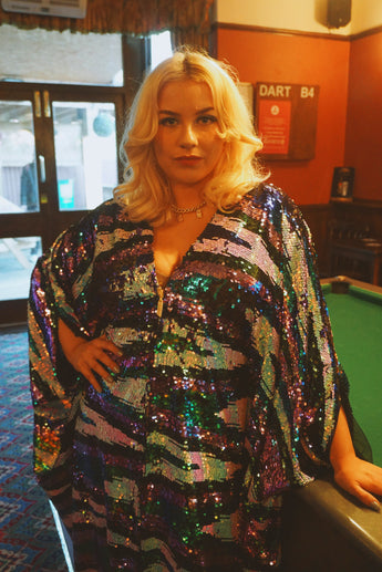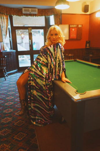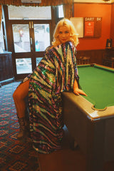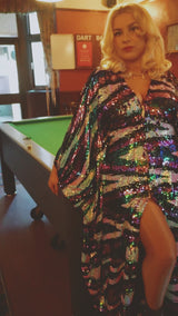 Beautiful sequinned Ziggy zipped kimono robe and kaftan gown combo featuring an iridescent white, lilac and green zig-zag pattern.