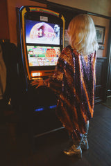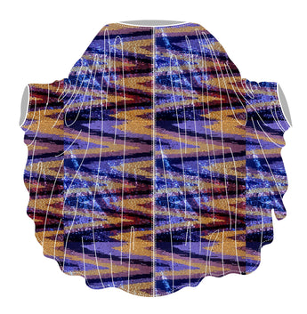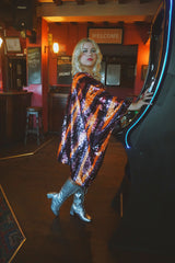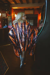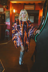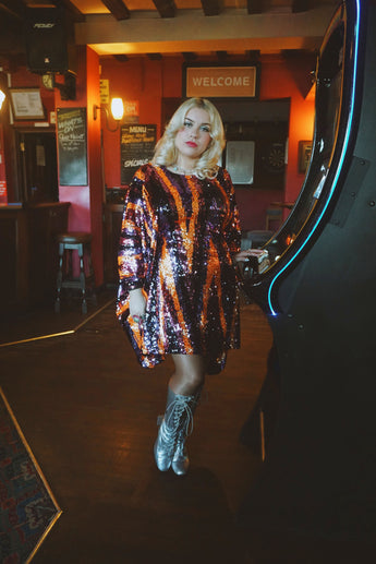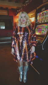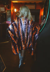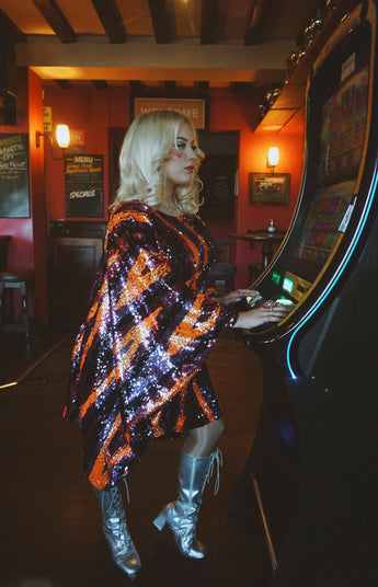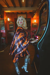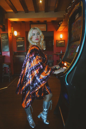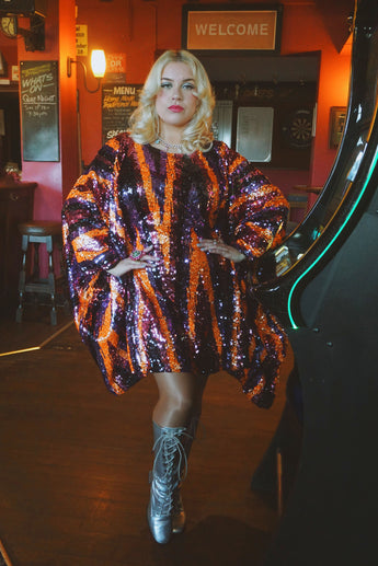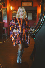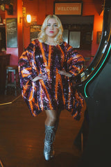 Beautiful sequinned Ziggy mini kaftan featuring an orange, purple, and pink zig-zag pattern.