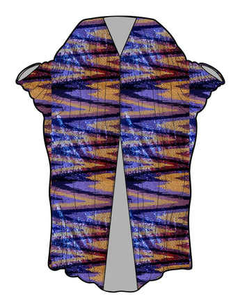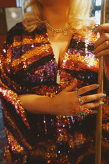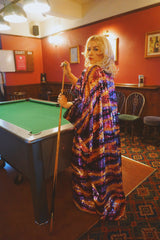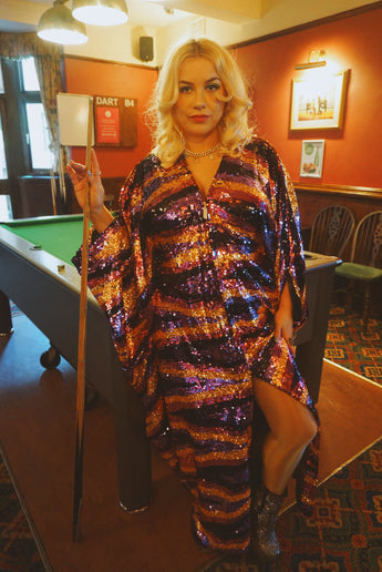 Beautiful sequinned Ziggy kimono robe and kaftan gown combo featuring an orange, purple, and pink zig-zag pattern.