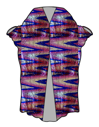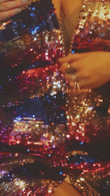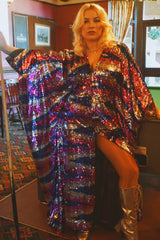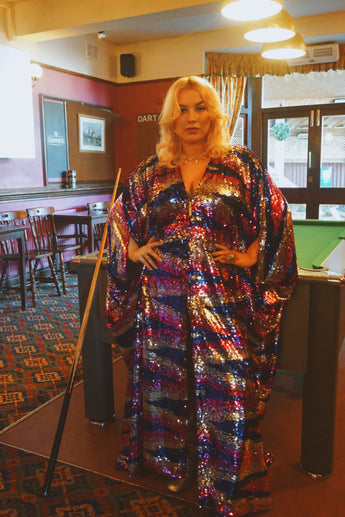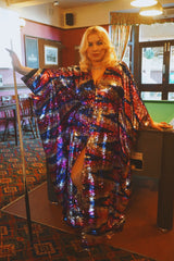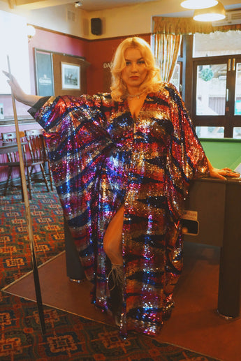 Beautiful sequinned Ziggy zipped kimono robe and Kaftan Gown combo featuring a pink, silver and blue zig-zag pattern.