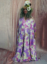 Free size (with full measurements below) and the kaftan dress style is fitted with hidden velvet ribbons on the inside meaning you can wear them two ways - 1) Free, loose and baggy, and 2) with the ribbons tied at the waist to pull the dress in and frame your figure. Unlined