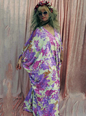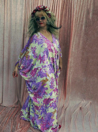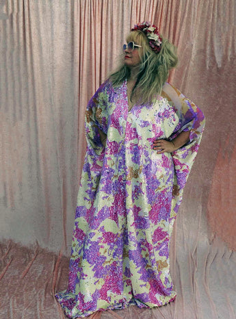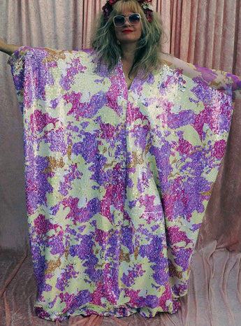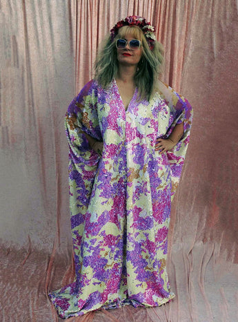 Another sequin kaftan addition for our collections! A truly unique sequin fabric! Square shiny sequins in creams, pinks and lilacs run throughout the dress, with a matching print mesh base at the top of the shoulders in an asymmetric fashion - adding to the fabrics obscurity and interest. The fabric is heavy due to the sheer volume of sequins. yet it is still comfortable and easy to move around in (and includes our signature hidden ribbons of course).