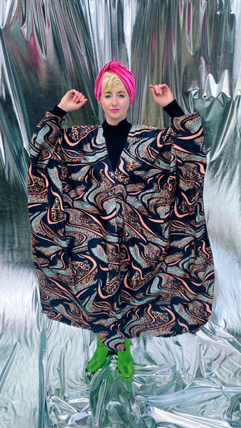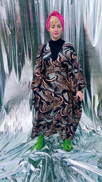 BADASS Leopard and coral print trackies come Kaftan Dress in a medium weight scuba and v-neckline. Soft to the touch with some stretch. Wear with something underneath or on its own as is.