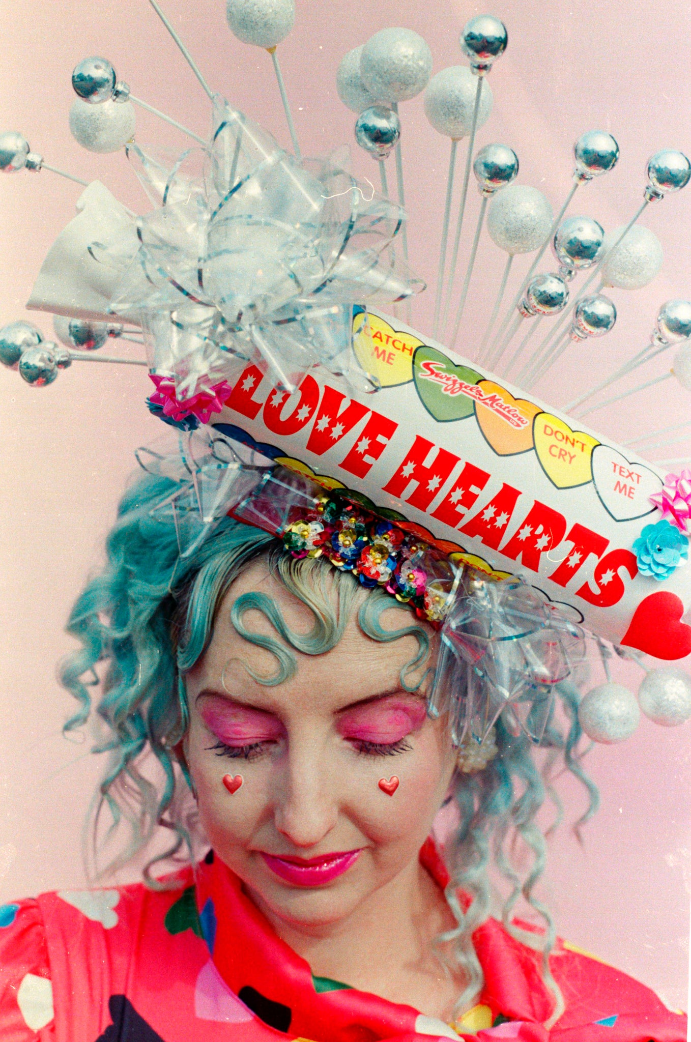 Truly special one of a kind headdress made from a giant plastic 'Lovehearts' Tube and smothered with fun sparlkles, sequins, bows and adornments.