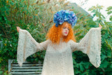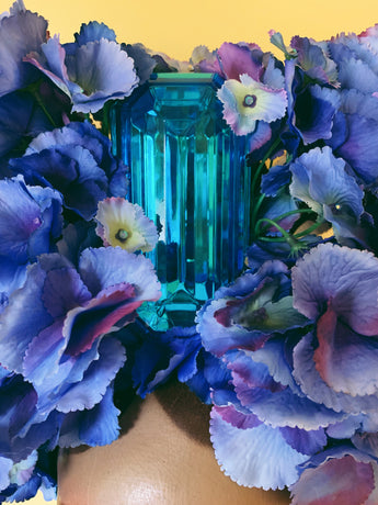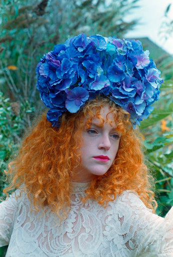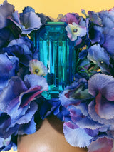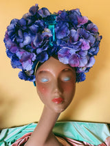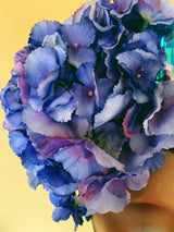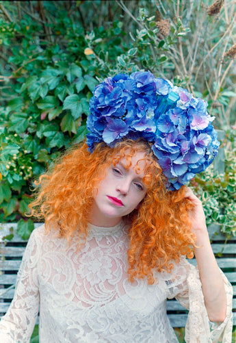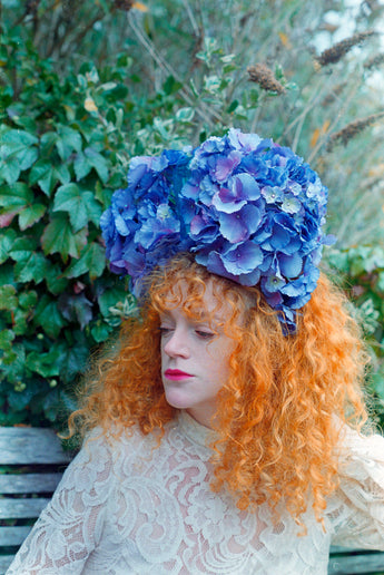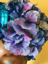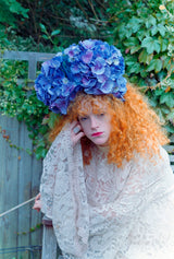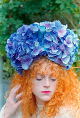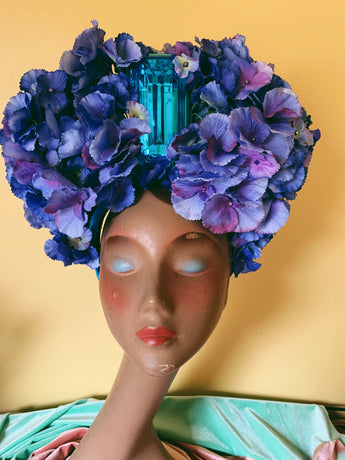 Bushes and blooms of sumptuous hydrangeas with a giant central giant gem centrepiece. Each visible blossoms centre has been encrusted with a gem of a complimentary colour to the rest of the headdress. The headdress is constructed on a padded Alice band with a metal comb attached for stability and comfort.
