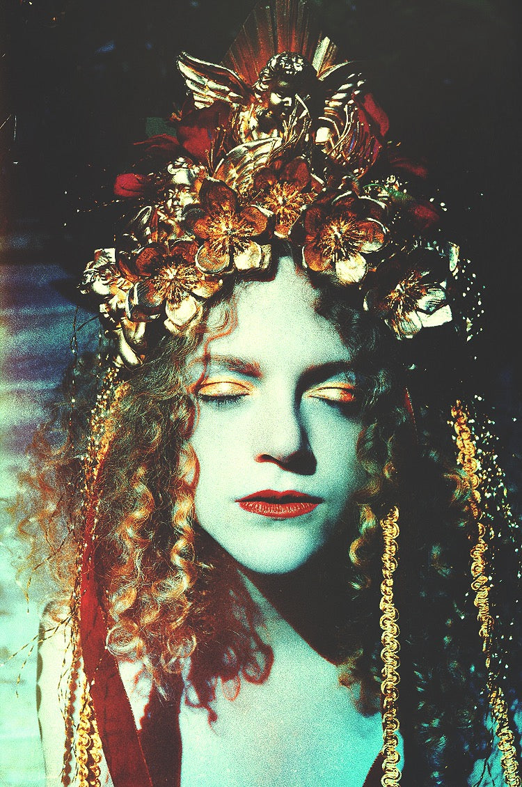 Gold Roses and Gold cherubs adorned on a black felt base with flowering glittering gold and red ribbons and secured elastic to fit any headsize. Reversible so can be worn two ways. Back has a red central flower.