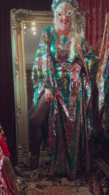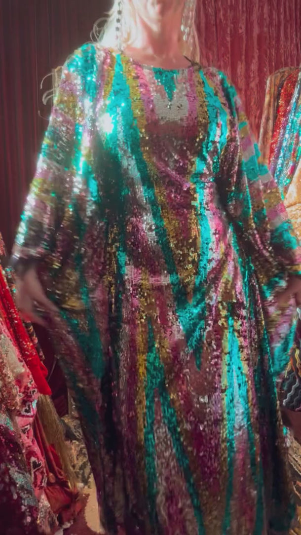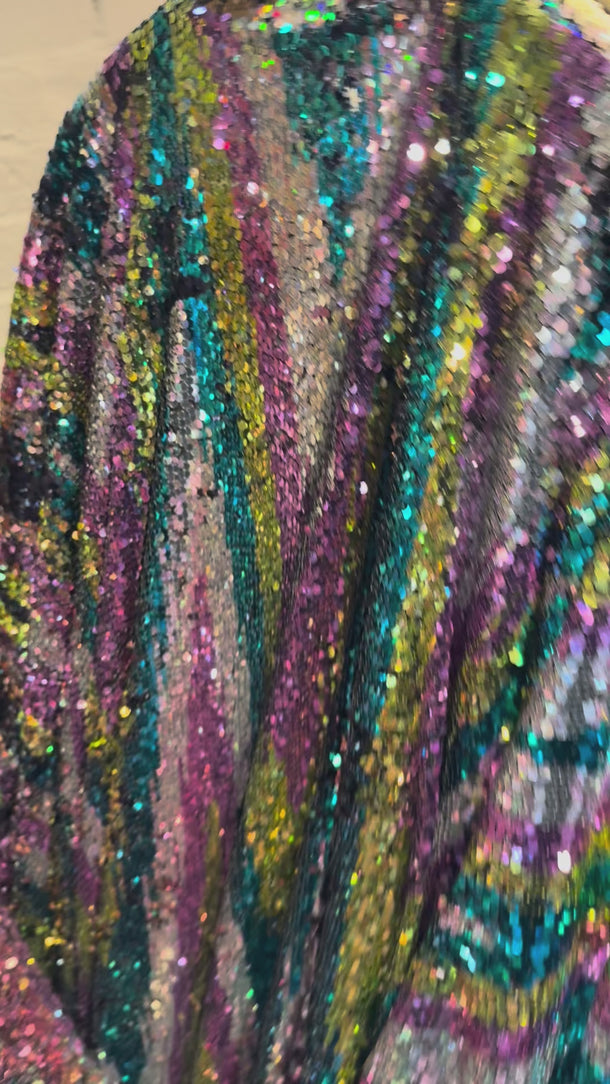 Sequin round neck with front and back ribbons, tapered sides and side split. May be some flaws as a sample piece