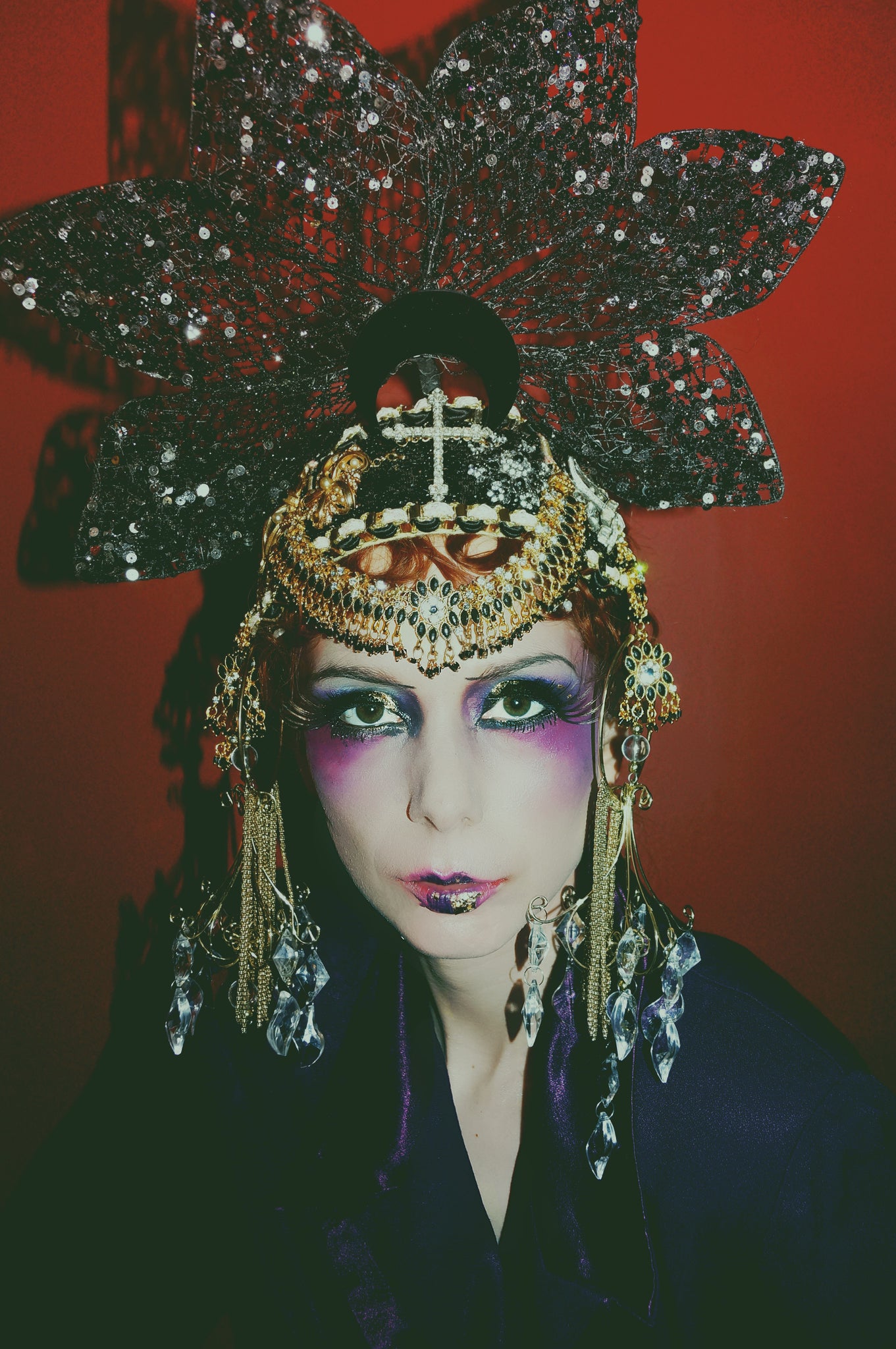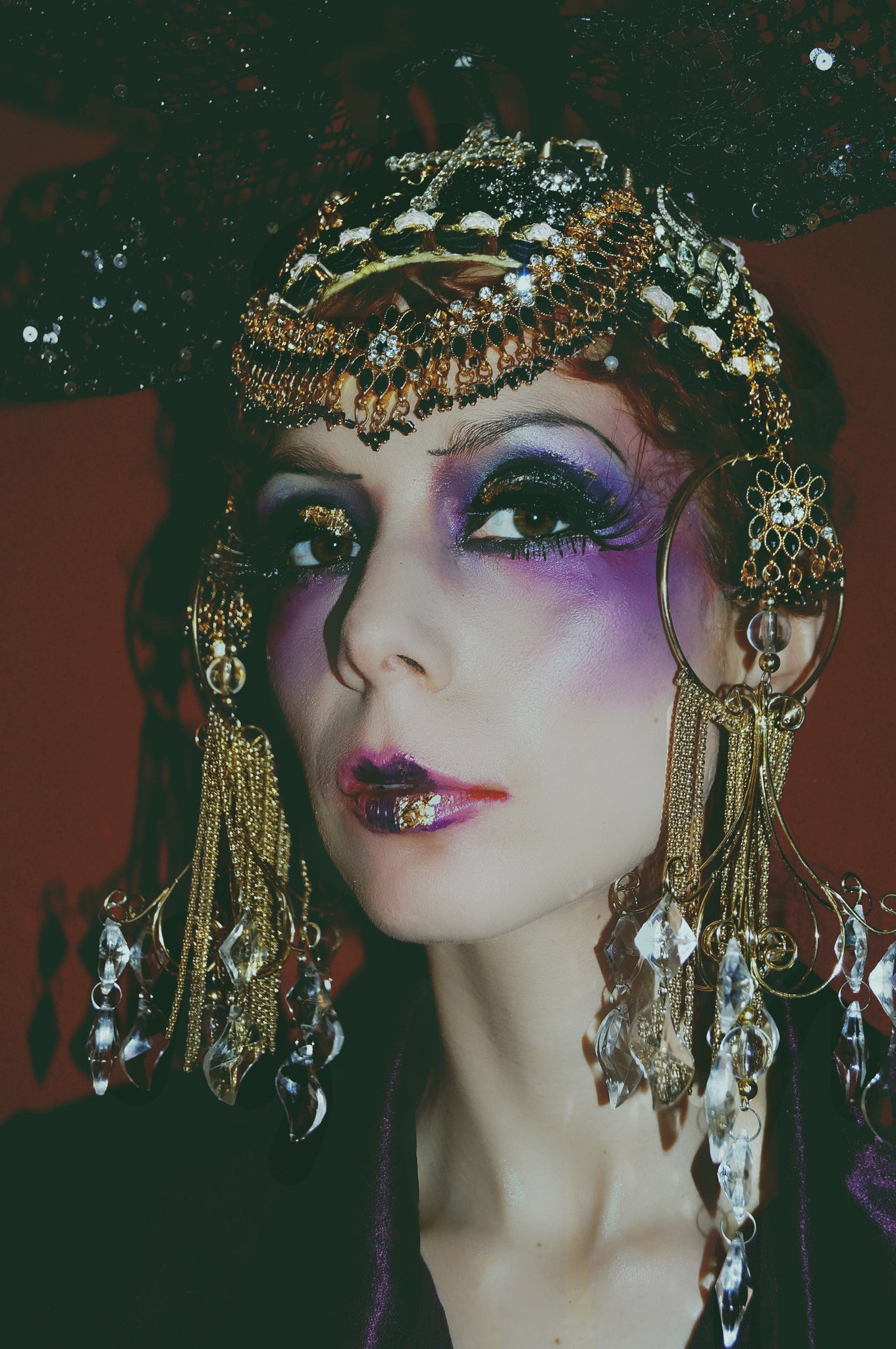 Giant Statement Black Headdress adorned in black and gold vintage jewels, brooches and charms. Huge chandelier dangle and plastic crystals at the sides and gold chains. Elasticated to be adjustable and fit any head size.