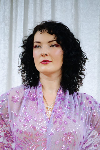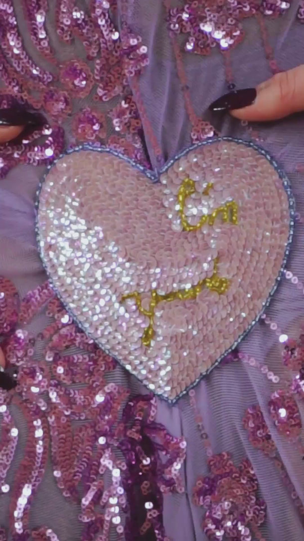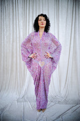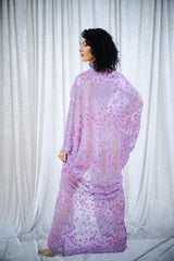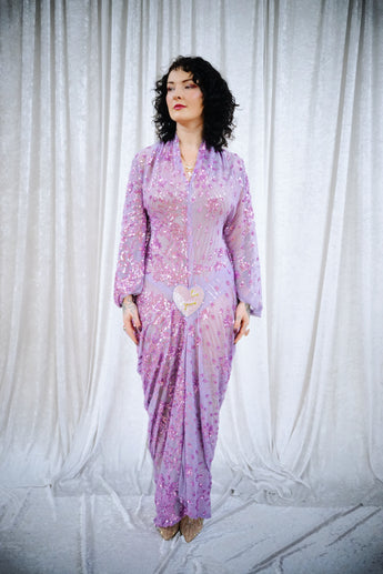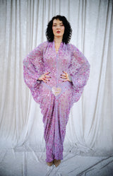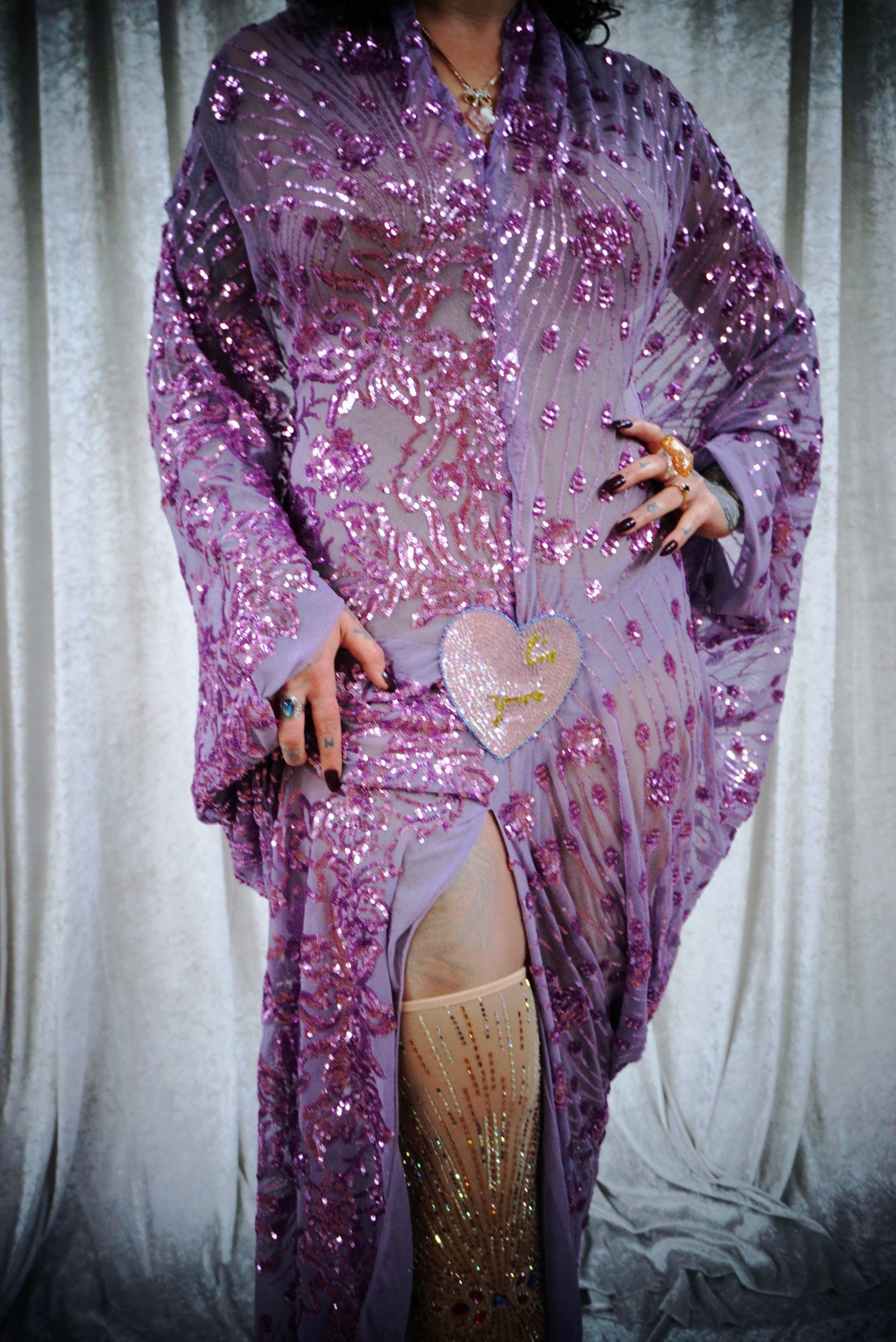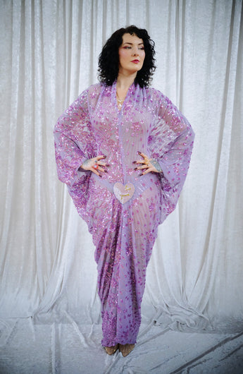 A flowing lilac batwing style kaftan, cut with dramatic batwing sleeves and drenched in scattered sequins that shimmer as you move. The silhouette falls effortlessly from the shoulders into a soft drape, finished with a statement heart sequin detail at the waist with the words "i'm yours". full front split up to the heart and the plunge neckline can be made to any length…