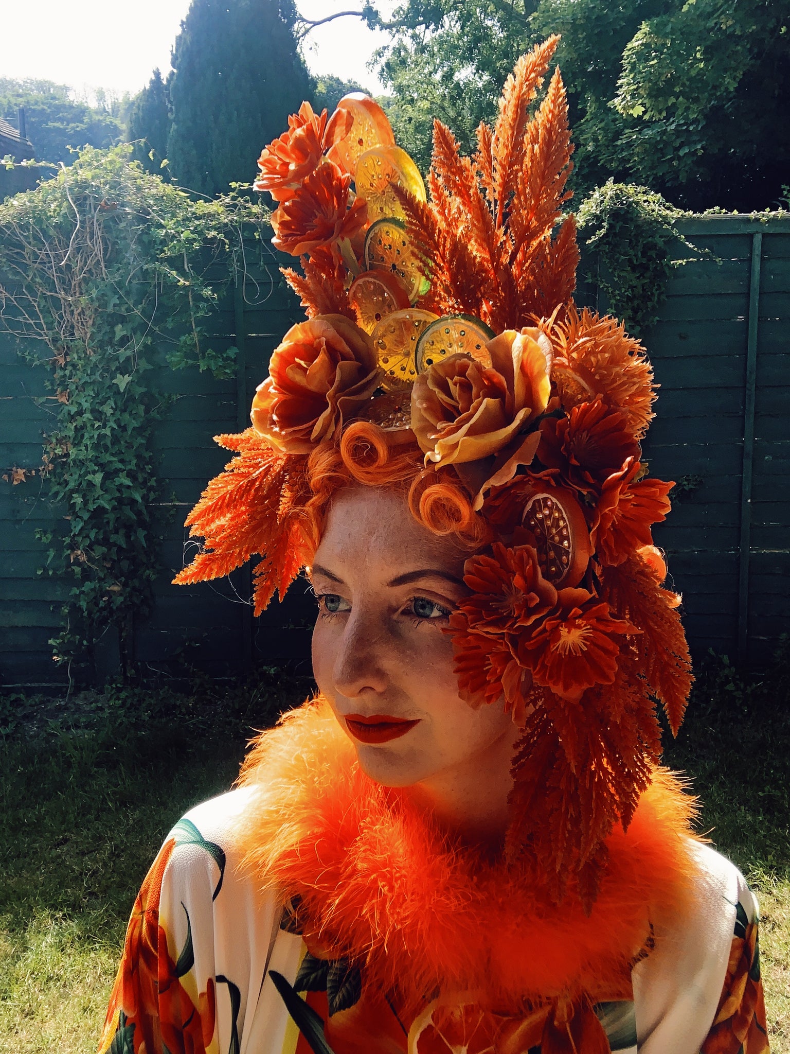 A beautiful Arrangement of vintage plastic orange flowers embedded with slices of oranges, lemons and limes which have all been bejewelled by hand to add a hint of sparkle.