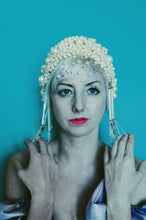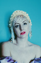 Plastic Pearl Encrusted headdress / skullcap. Can be worn with either side as the front or back (one side Fringed with vintage glass dripping beads). Hundreds of faux pearls in various sizes adorn this one off bespoke piece. Something similar can be made as a commission on request. Please get in touch for further details.