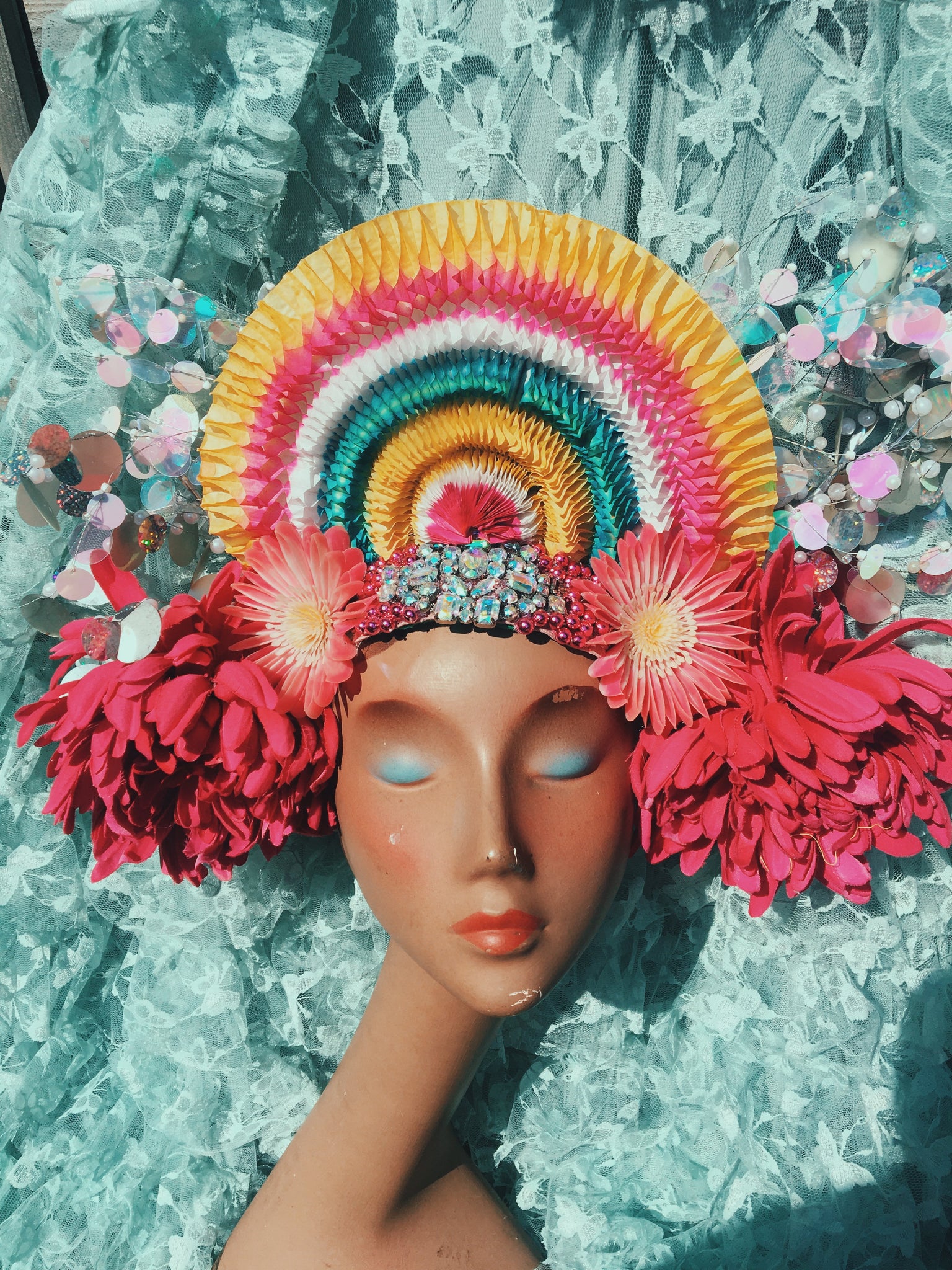 Statement headdress with central paper honeycomb fan, huge pink florals, sequin iridescent and silver sprays and central jewels. Boxed and ready to ship.