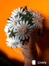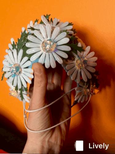 Plastic white daisies with scrunched iridescent centres and plastic green leaves attached to a felt base and elastic that sits at the nape of the neck for support and to fit any headsize.