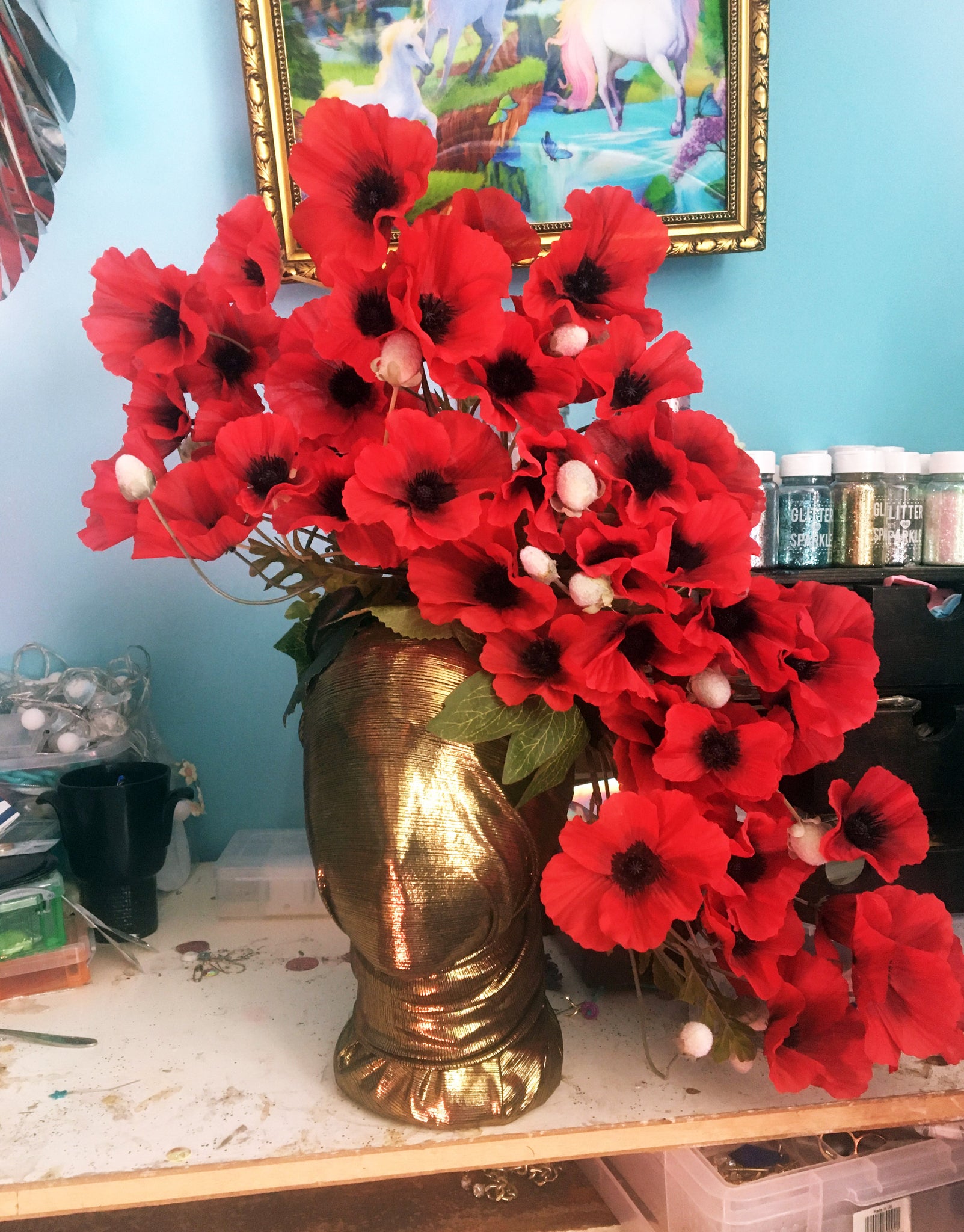 The headdress itself is made up of red poppies on bendable wire, so you can shape and mould the piece to your liking. It's attached to a stiffened felt back with elastic stretching at the nape of the neck to allow for comfort and security and to fit any headsize. It also makes a great display piece as photographed on the mannequin head.