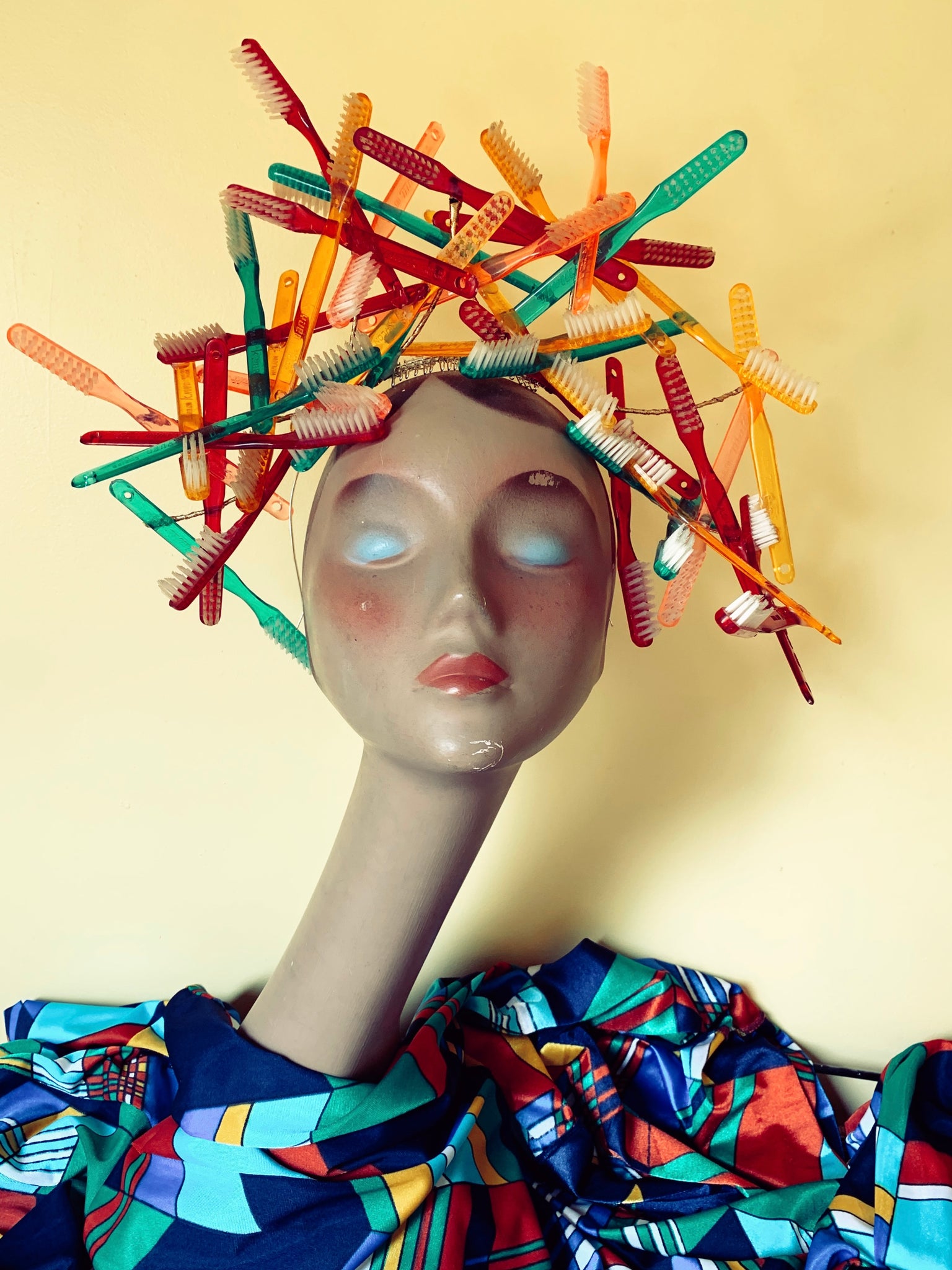 A truly one of a kind show-stopping statement headpiece. An original 50s toothbrush collection in yellow red green and pink colours, are constructed on a wire base and finished with authentic 50s metallic gold thread. The piece is secured on a thin metal headband with a comb at the front to keep the headpiece sturdy and avoid any slipping. Please be aware the piece is fairly fragile so care needs to be taken when wearing. Also makes a fantastic display piece.